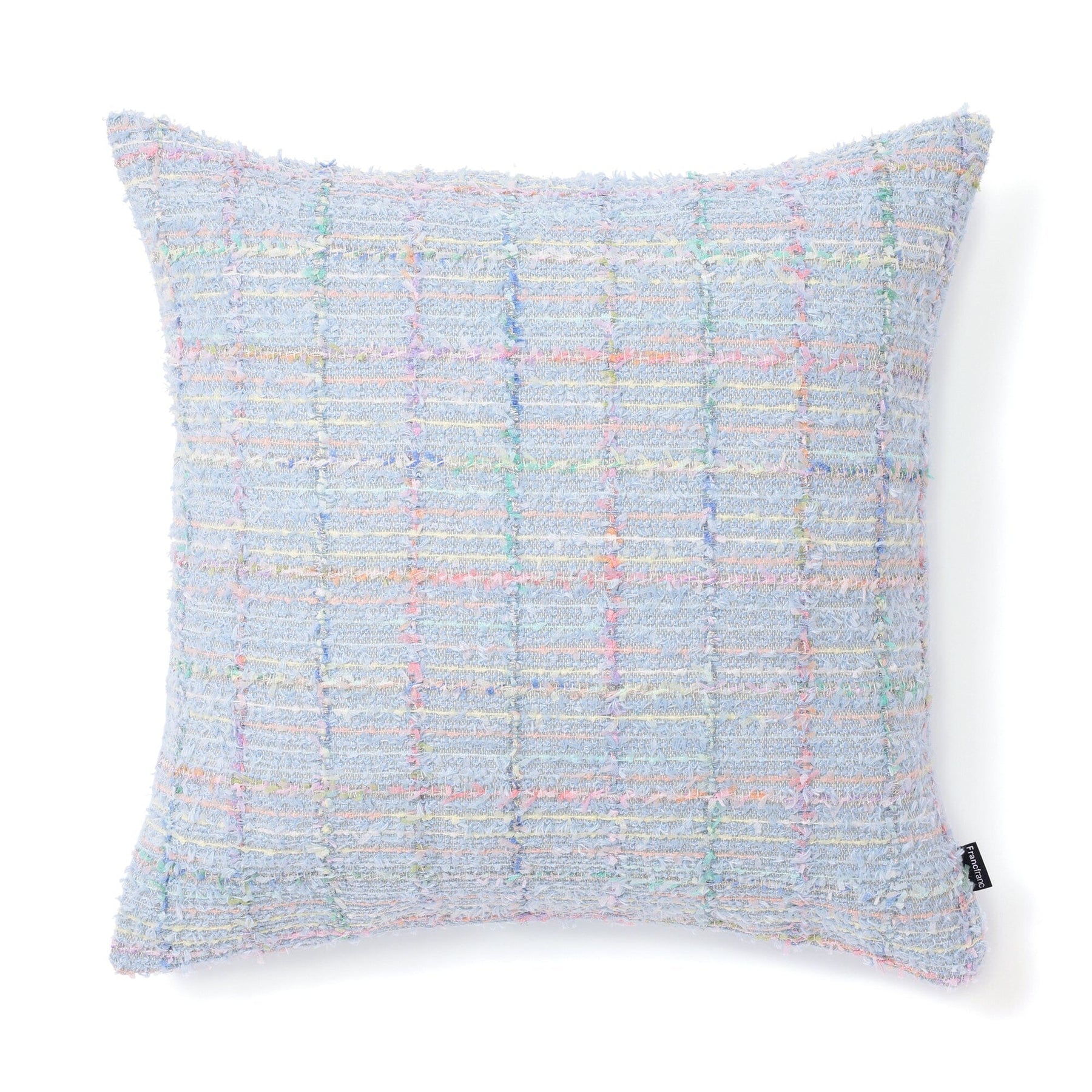 This trendy cushion cover features a refreshing blue base and a checkered pattern woven with colorful threads.