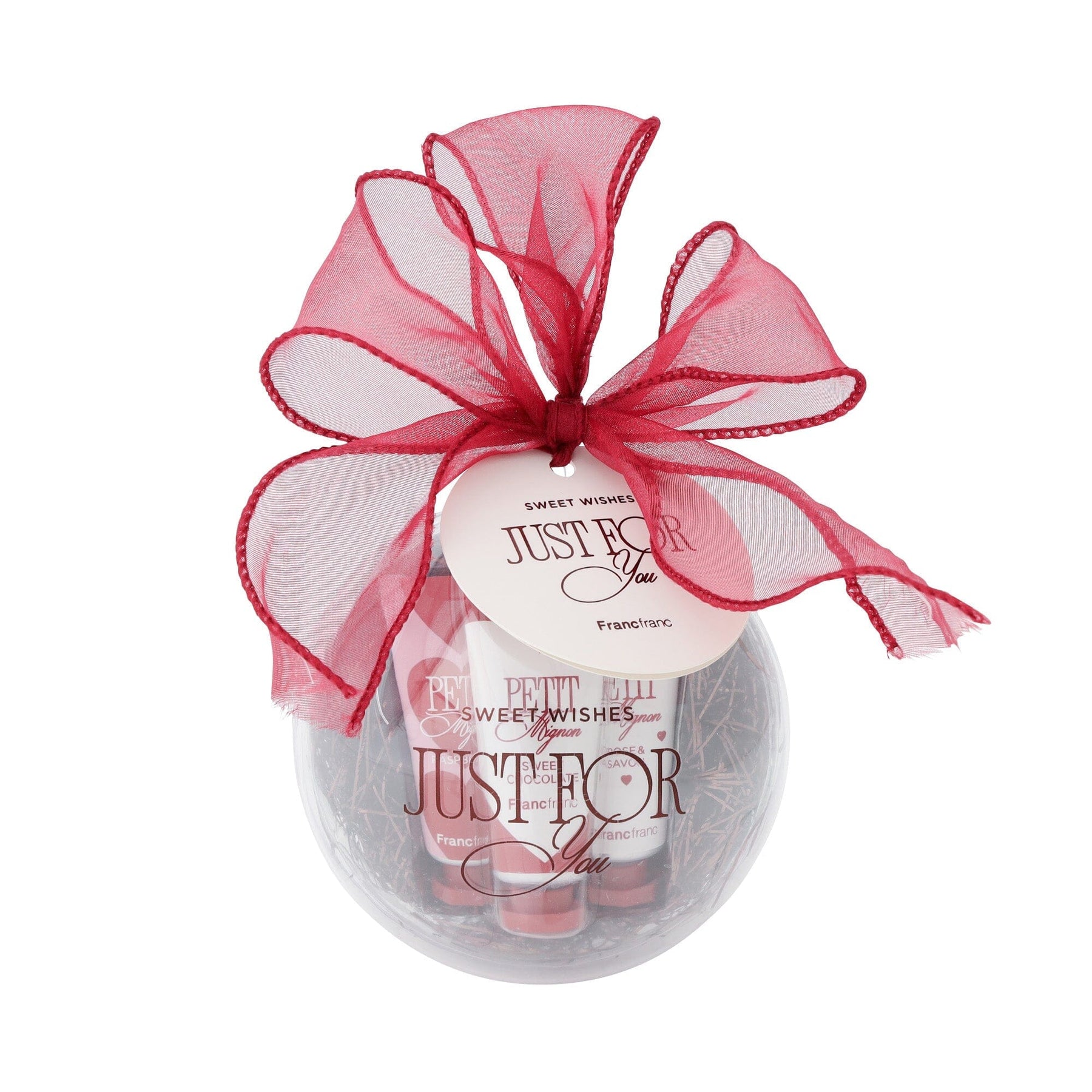 A hand cream set in a round, clear ornament-like container that comes in three different scents.Contains moisturizing ingredients to leave your hands feeling smooth.