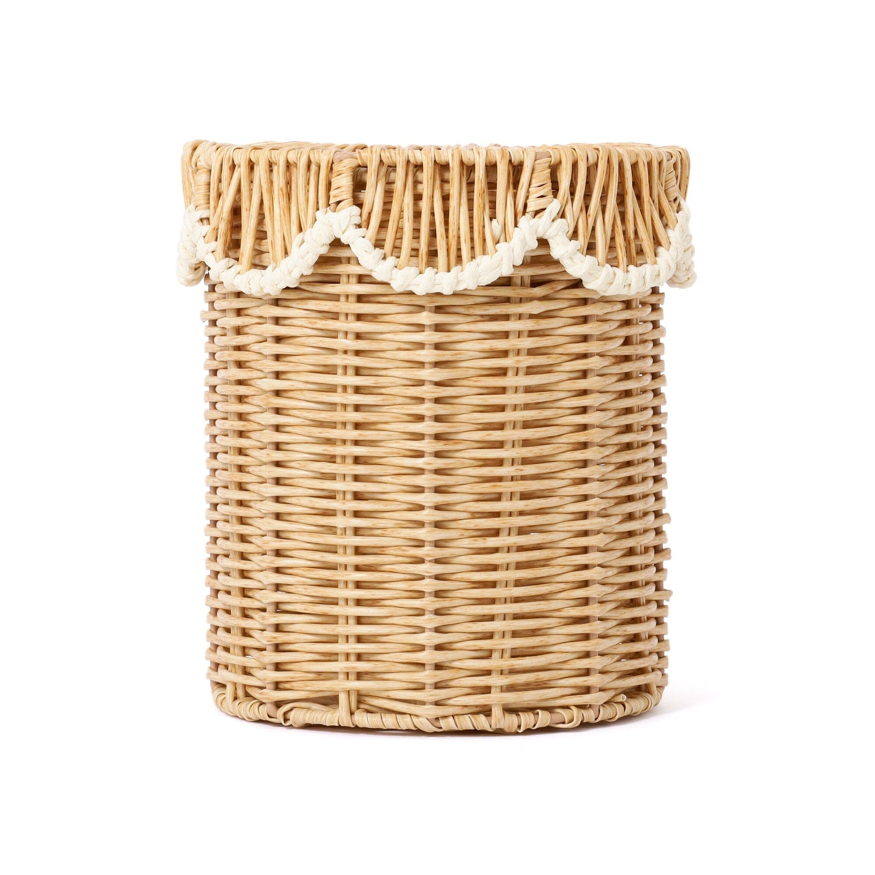This is a rattan-style trash can made of plastic.