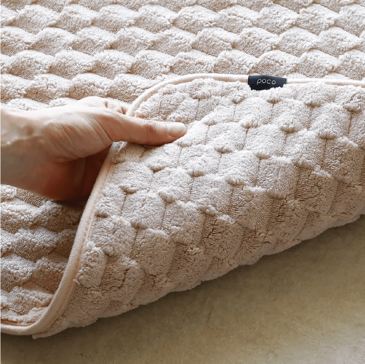 This bath mat is made of microfiber towel material and has a soft, bubbly feel that's incredibly comfortable.