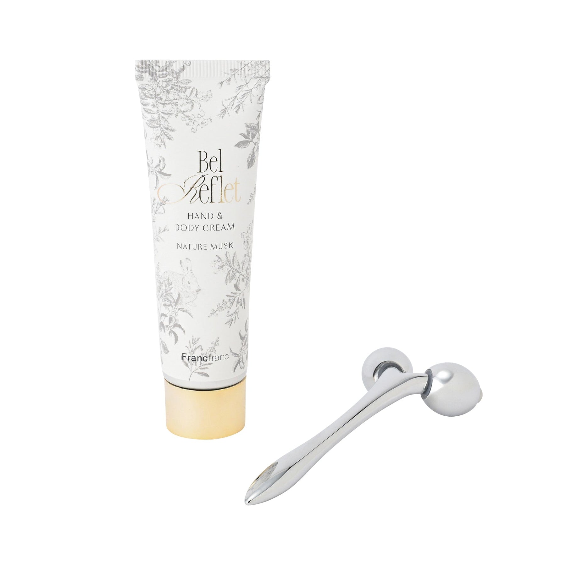 This two-piece set includes a hand and body cream and a mini face and body roller.