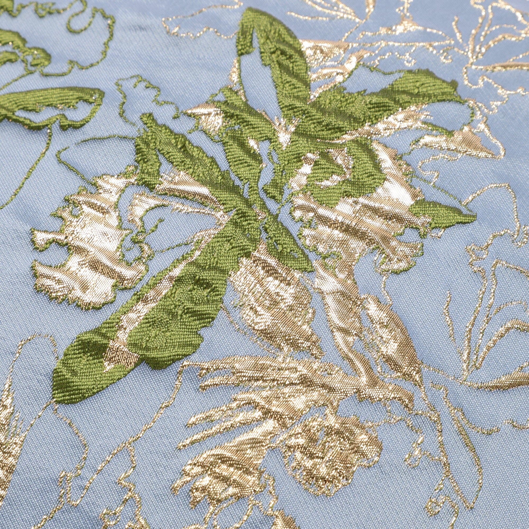 This cushion cover features a floral motif and a jacquard weave with metallic threads.The green and gold lines stand out against the calm blue background, creating a sophisticated impression with depth.