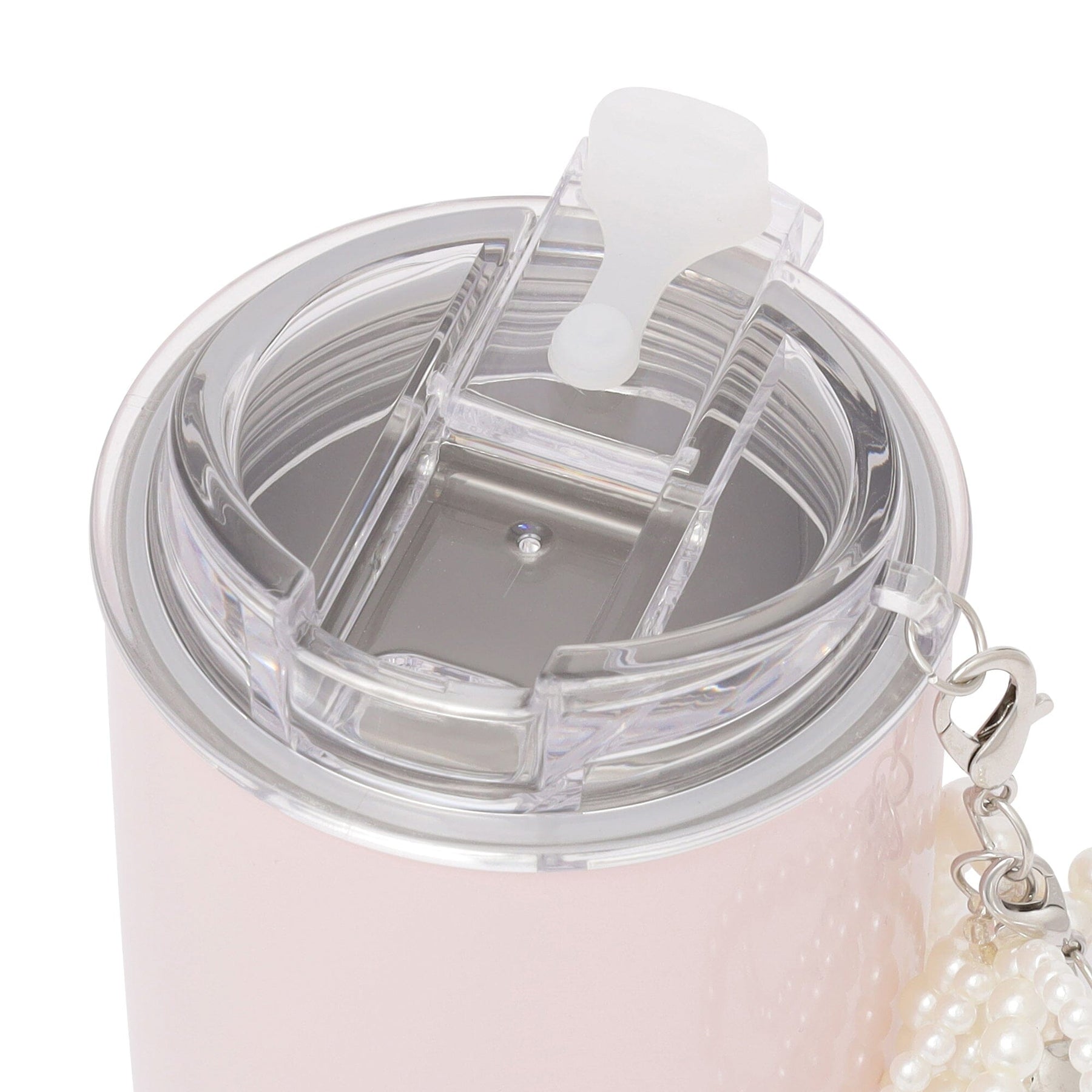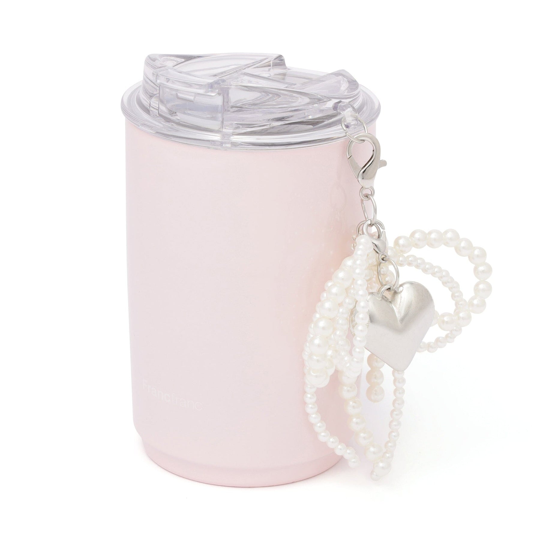 This stainless steel tumbler features a trendy pearl ribbon and heart charm.