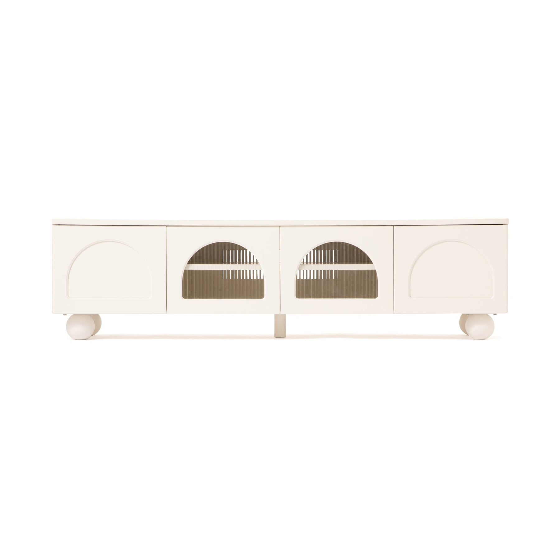 This TV stand features striking semicircular doors and rounded corners, creating a unique and trendy look.The two central doors are made of glass, allowing you to operate the remote control even when the doors are closed.