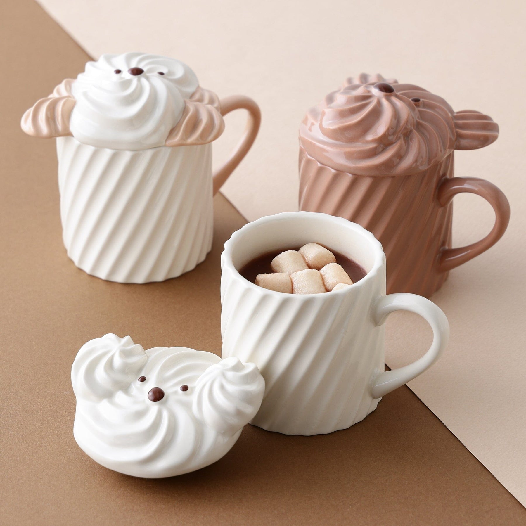 This lidded mug features cute animal faces that look like they're made from fluffy whipped cream.