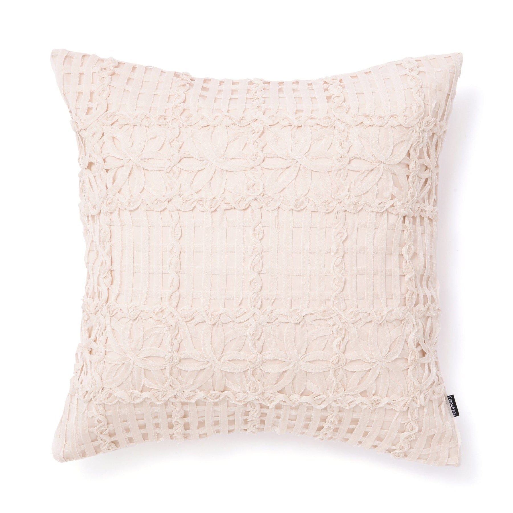 This cushion cover is crafted from chiffon fabric and features a floral motif arranged in a grid pattern.