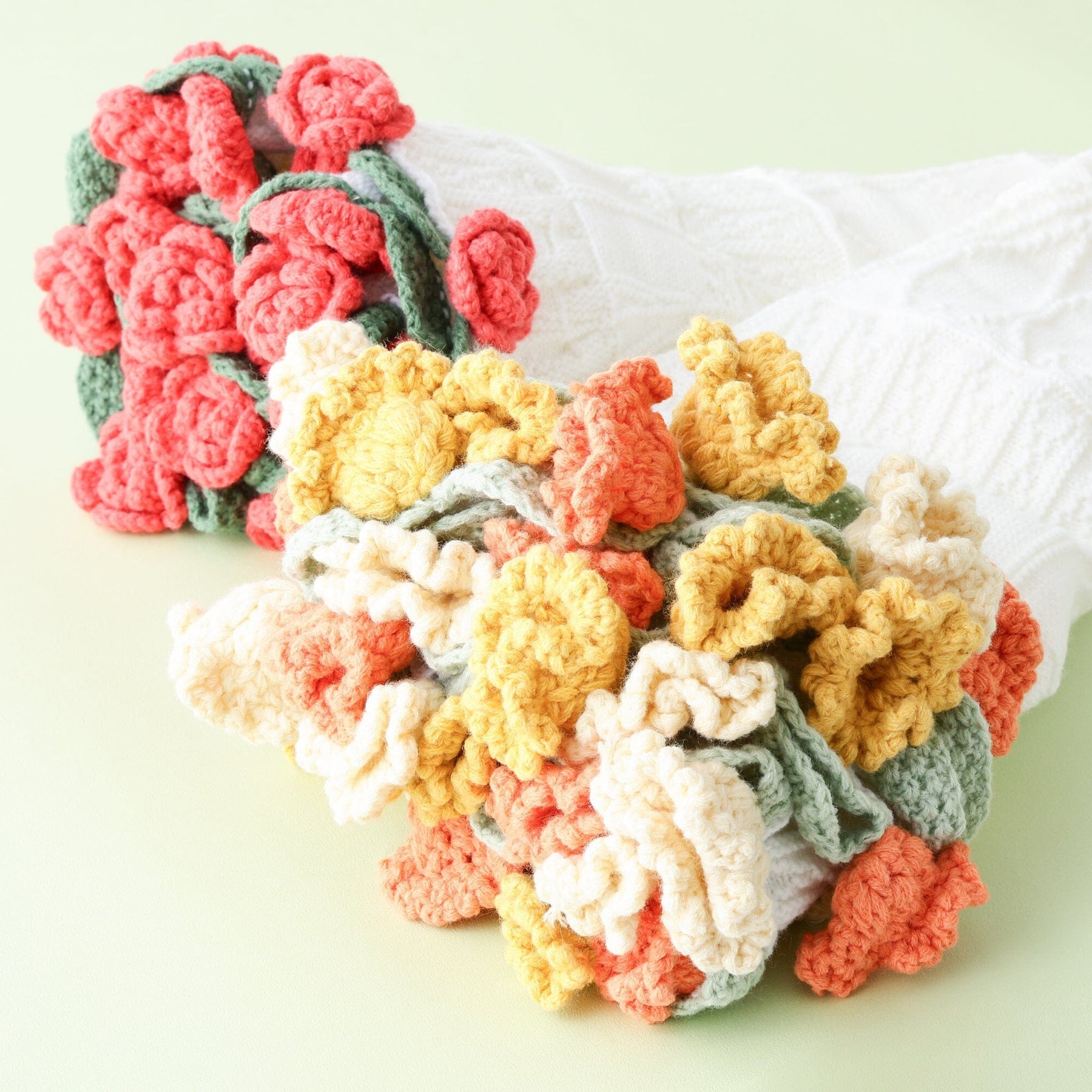 Each flower is hand-crocheted, with meticulous attention paid to the shape of the petals.