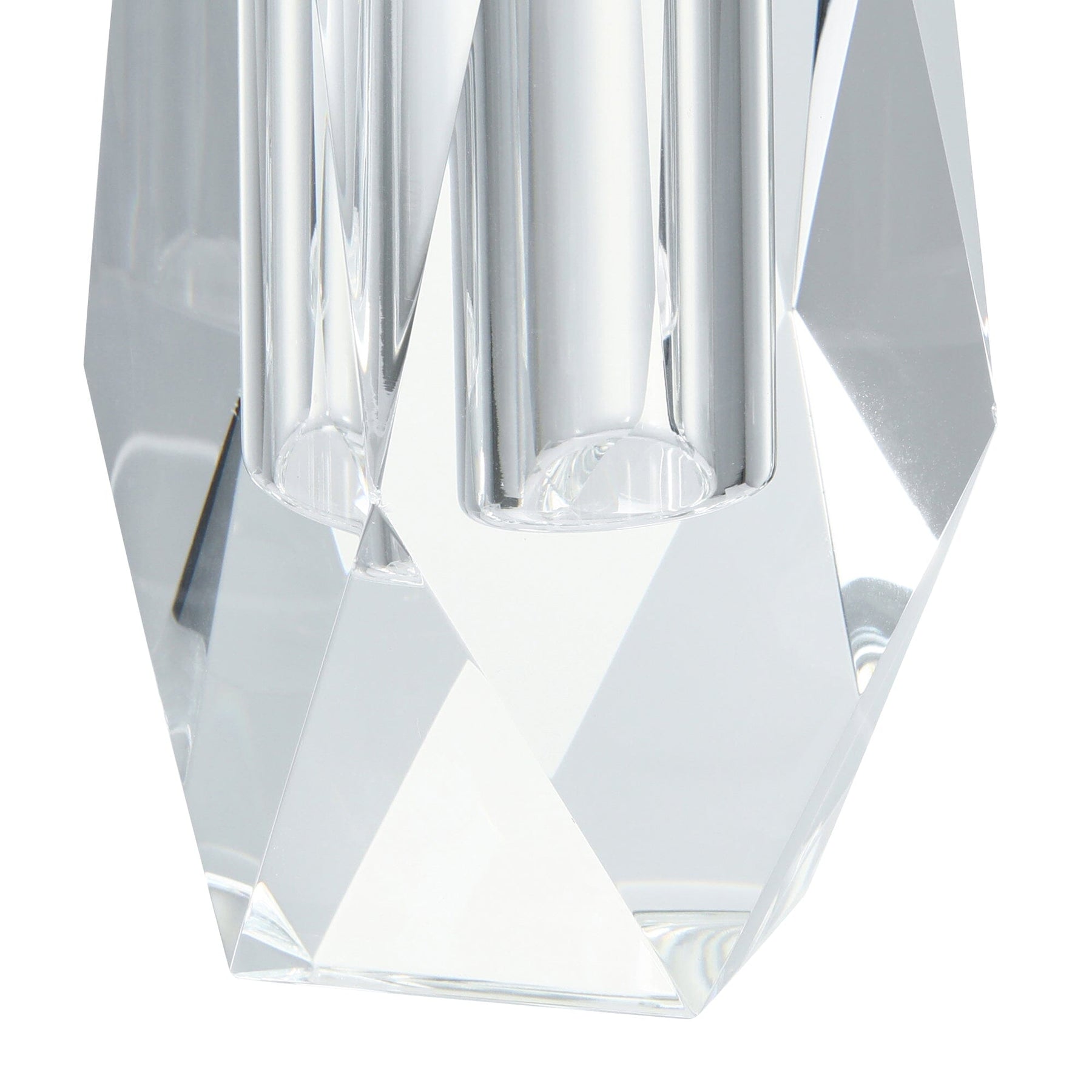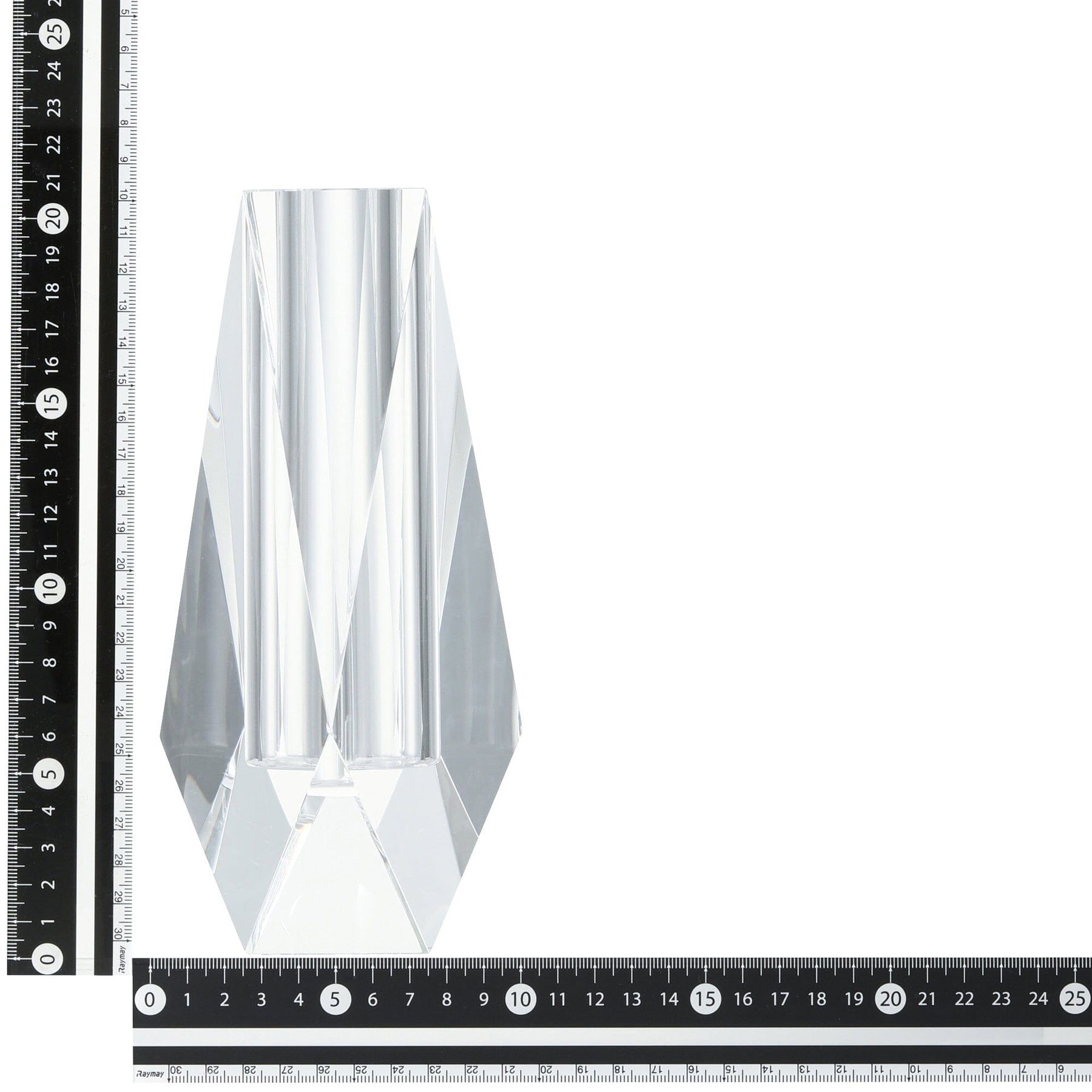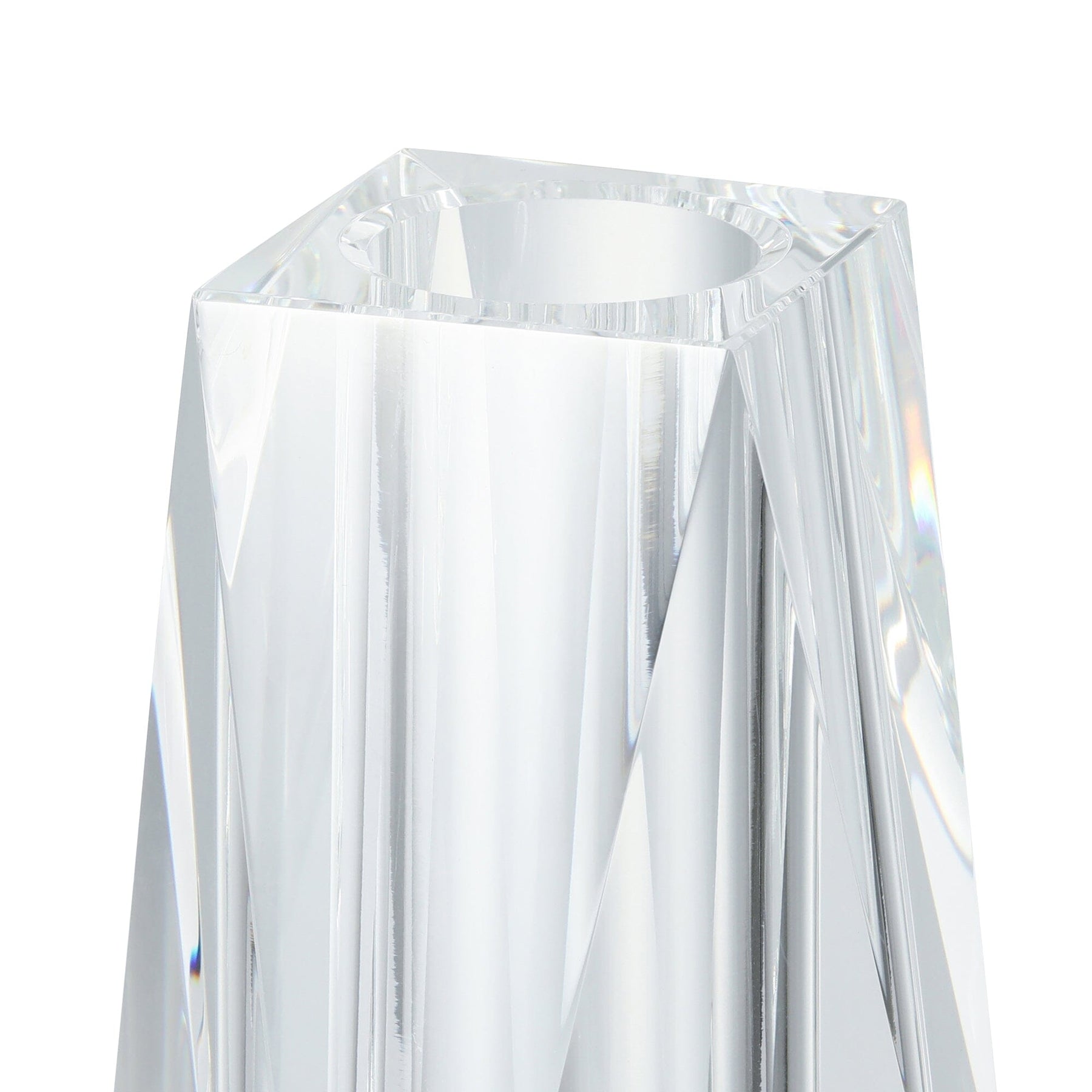 A glass flower vase with crystal cut details.Its sparkling appearance reflects light.