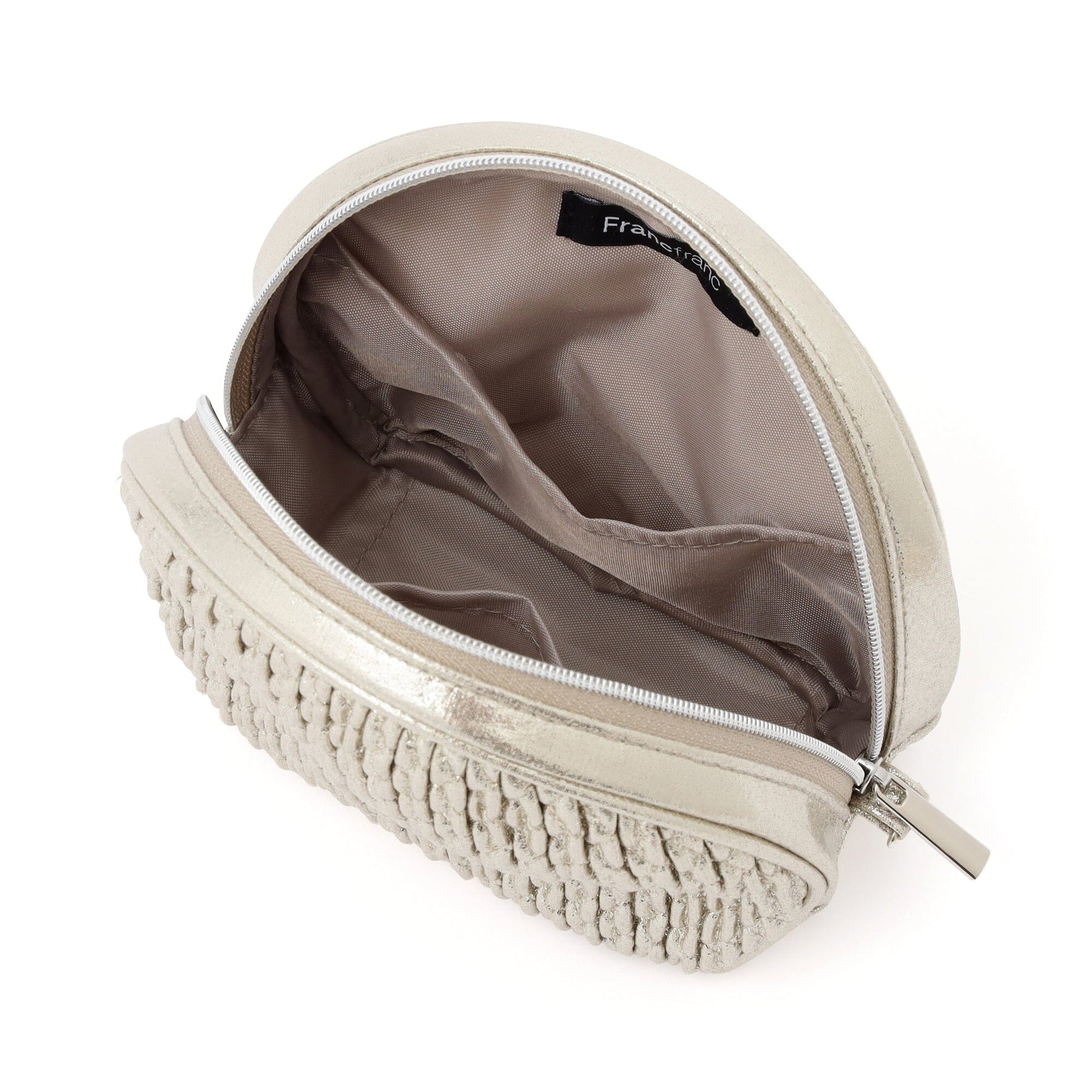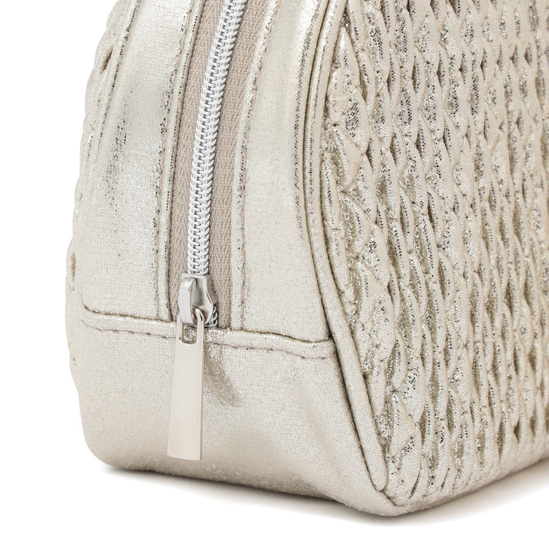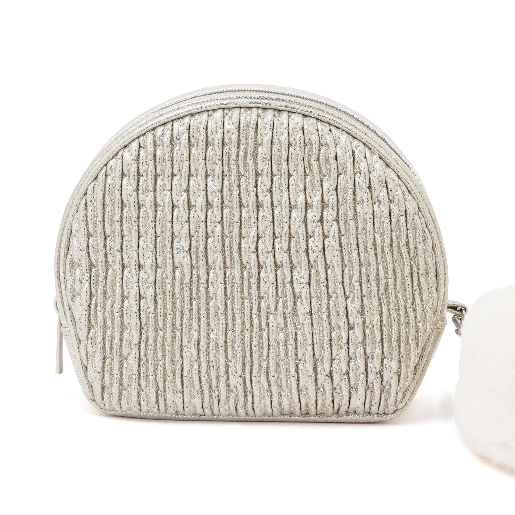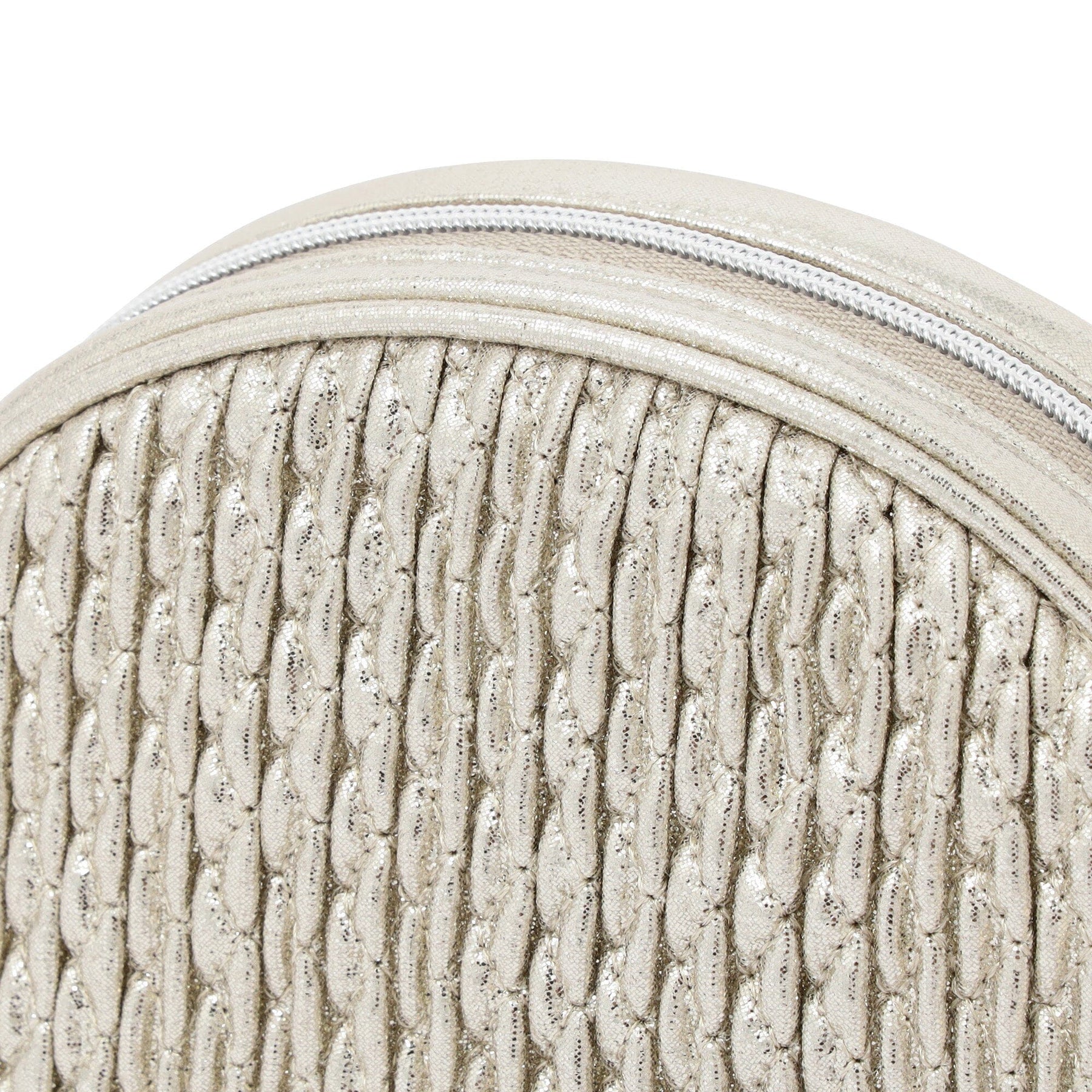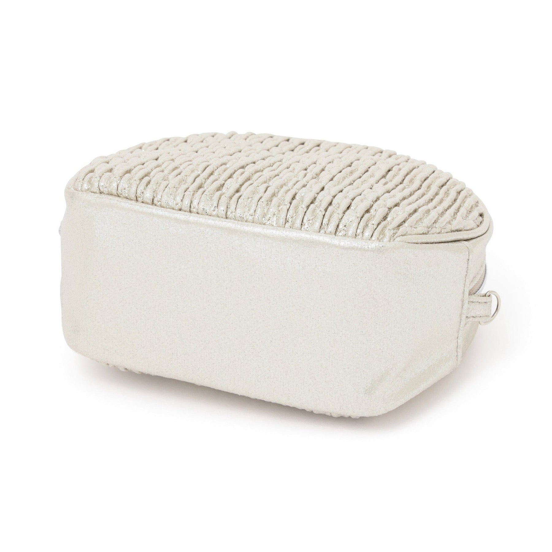 Made of glittery and metallic foil synthetic leather. The shirring adds a textured finish to the fabric, further enhancing its dazzling design.