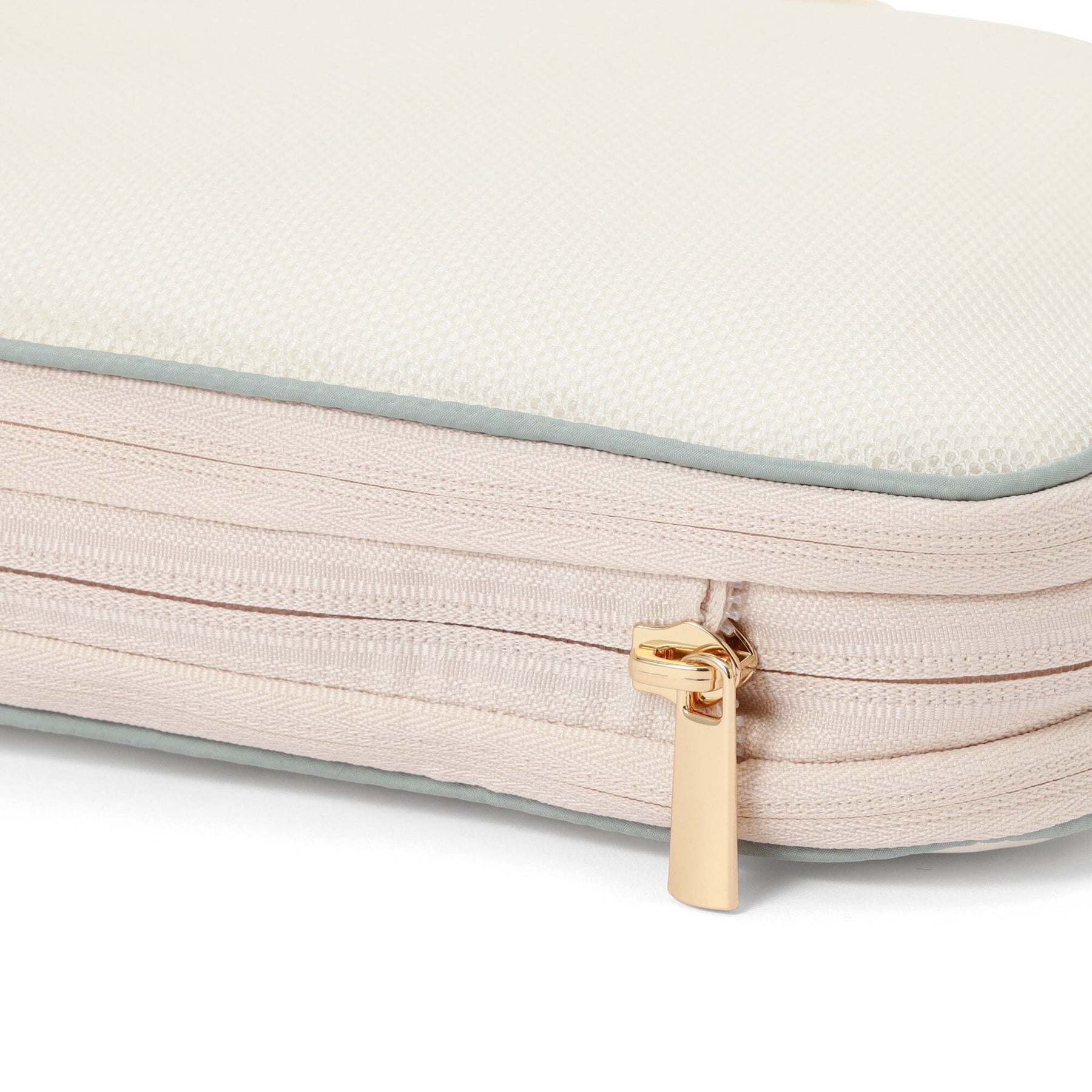Simply close the zipper on the outside of the organizer one and a half times to compress the clothes inside.