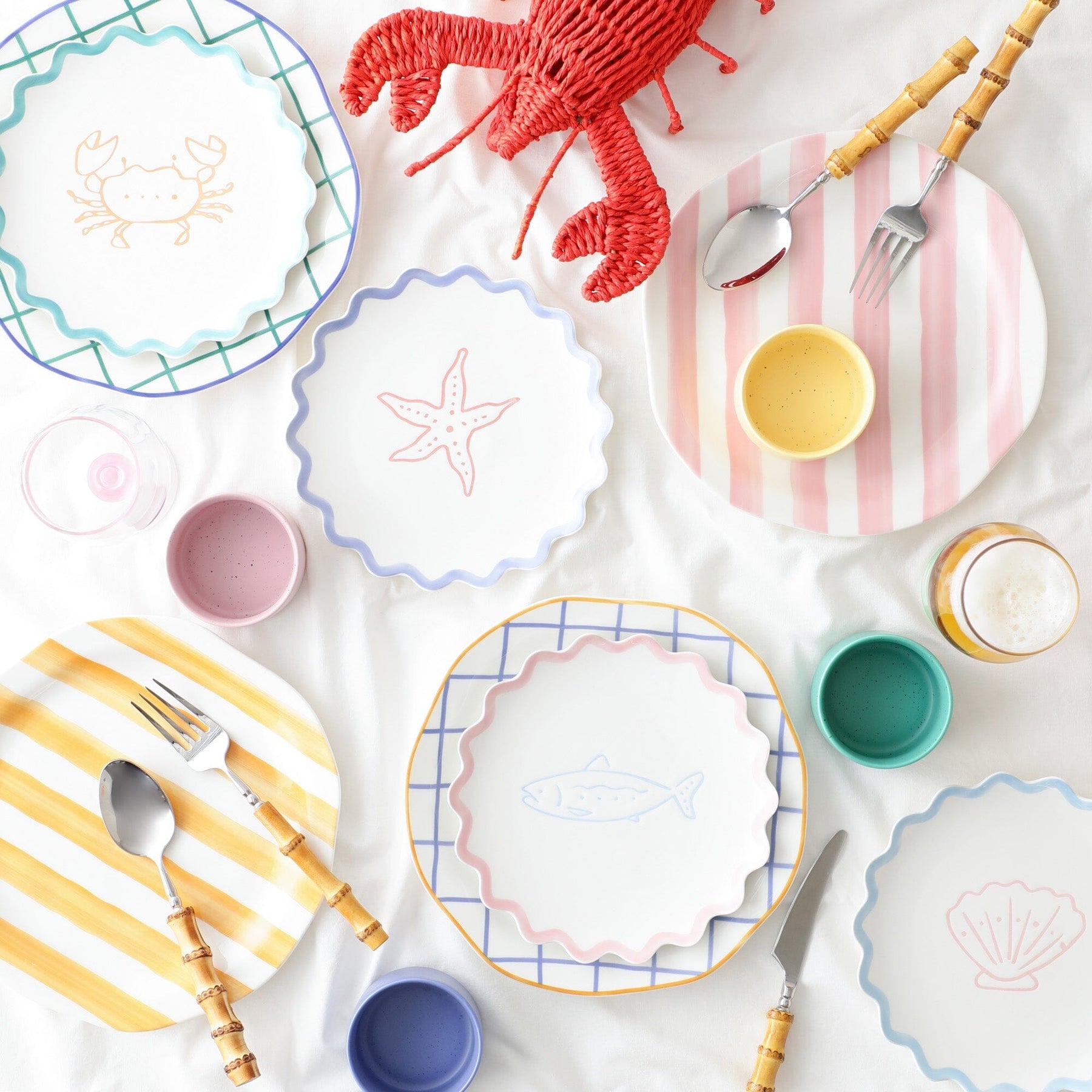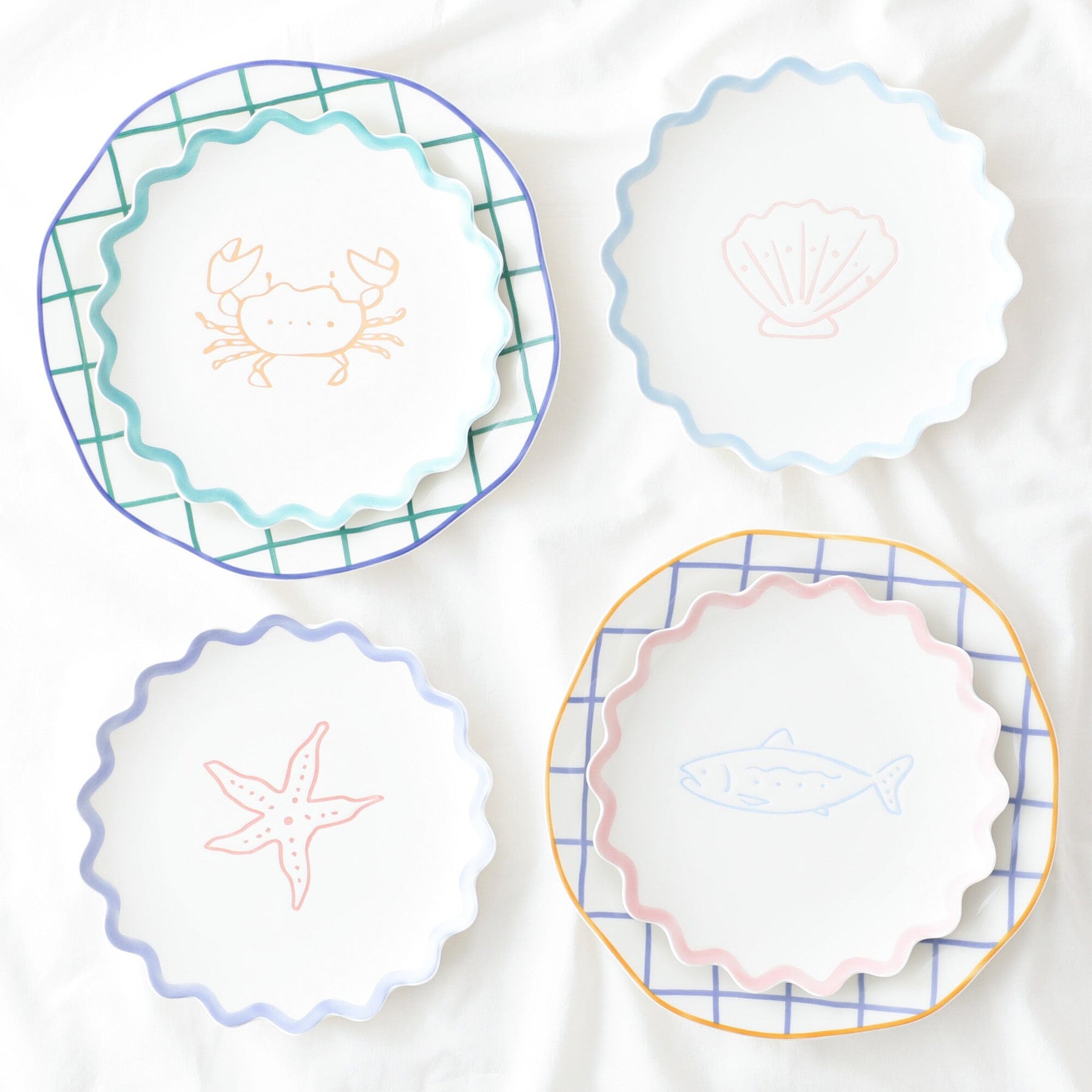 This is a medium-sized plate with a wavy design featuring illustrations of sea creatures.We recommend pairing it with the large plate or the splatter dip bowl from the same series.