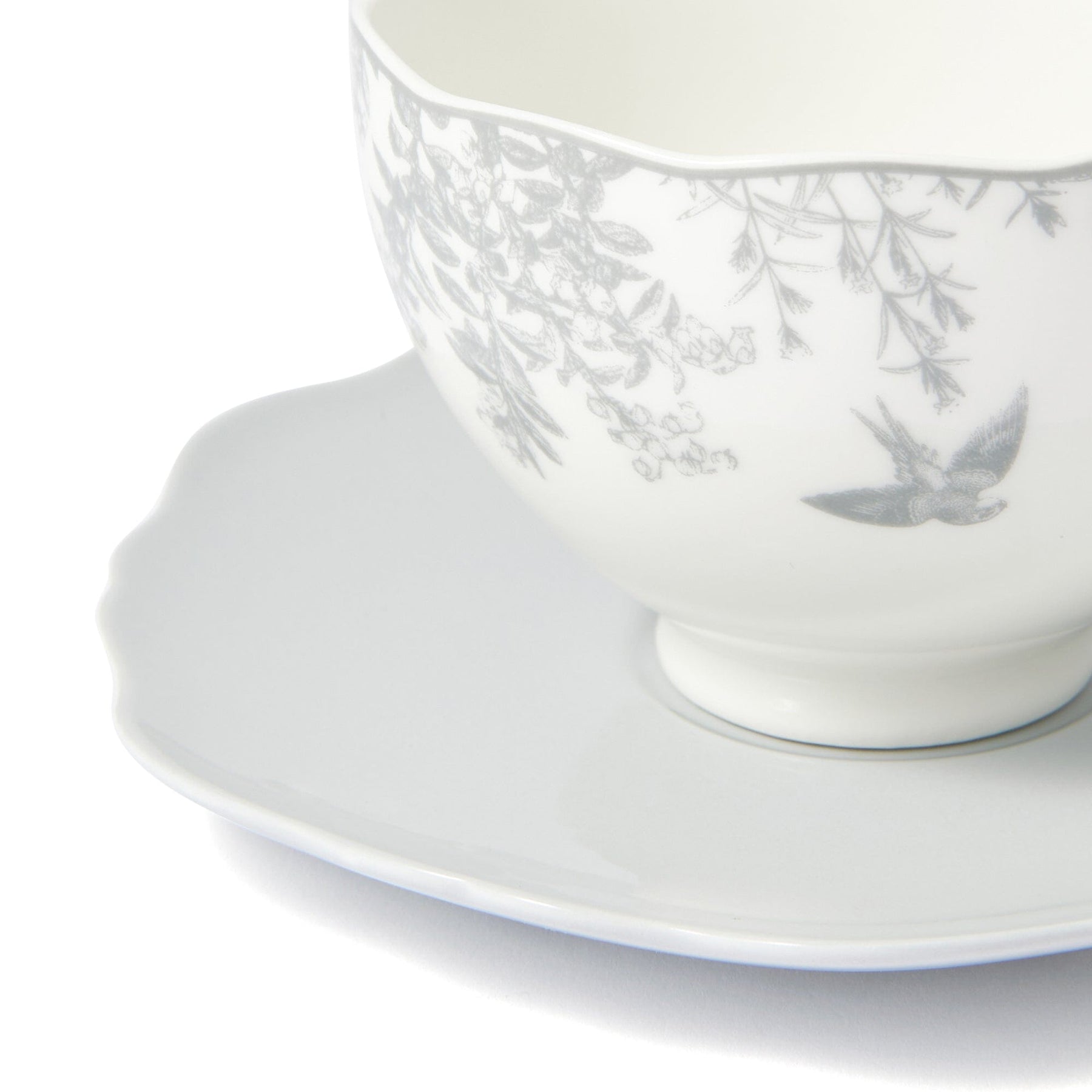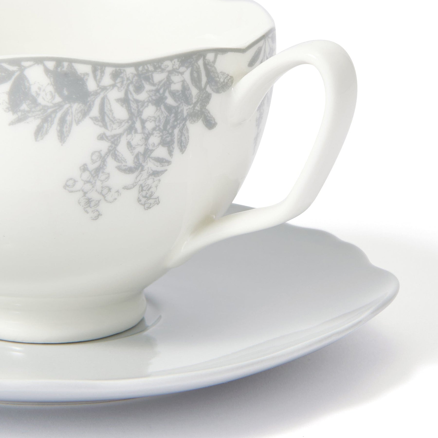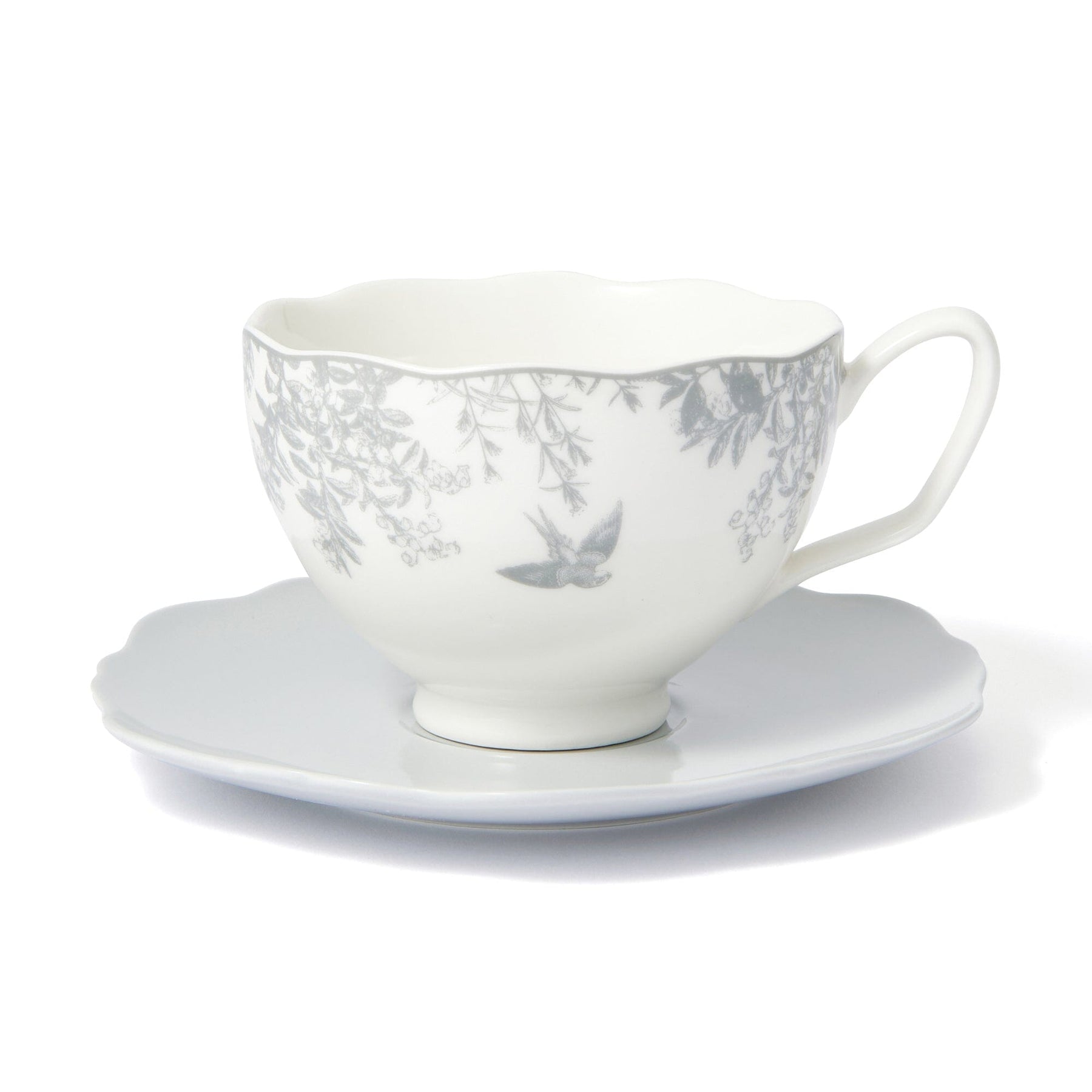 This cup and saucer features a classic and elegant Toile de Jouy pattern.