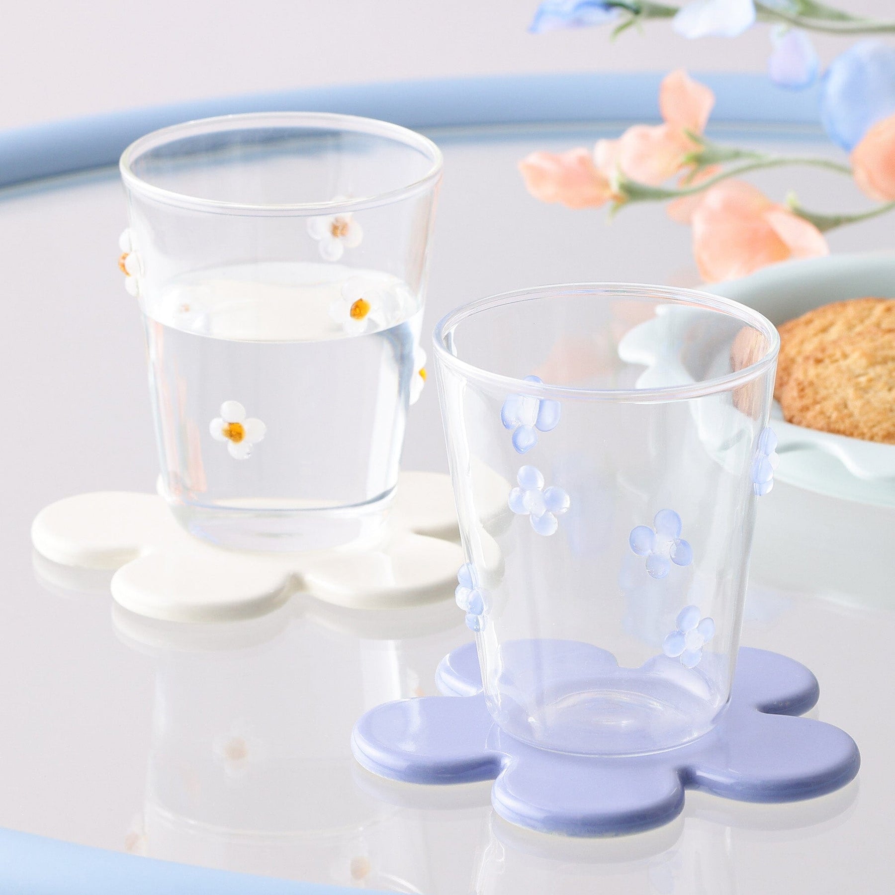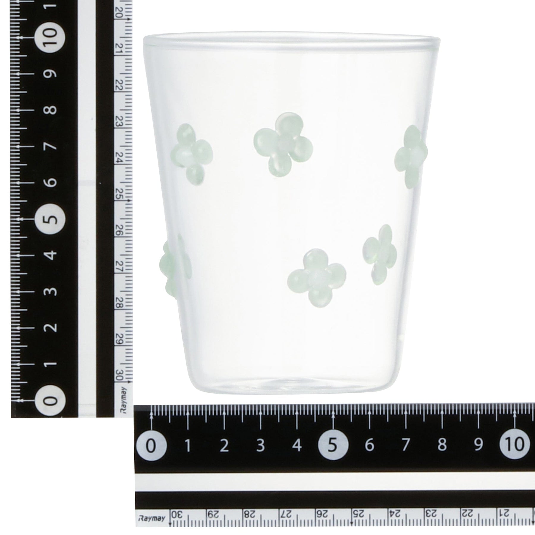 A simple glass tumbler with plump flower motifs.A cute design that is easy to use every day.