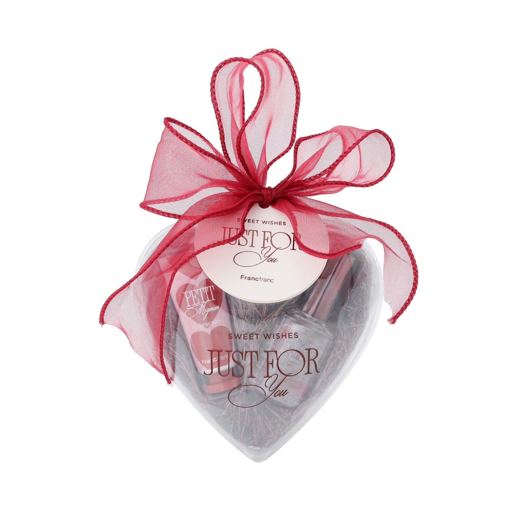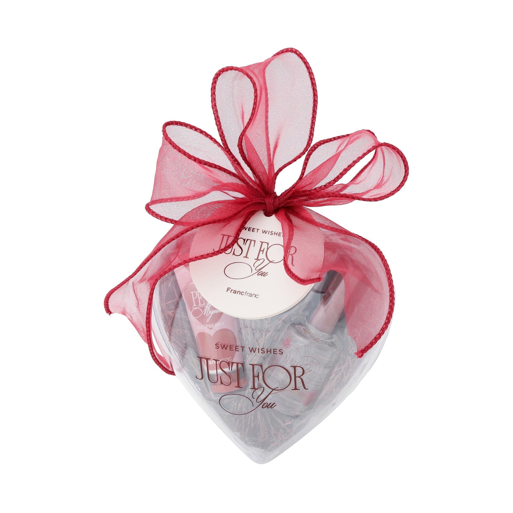 A hand care set containing nail oil and hand cream in a heart-shaped clear container that resembles an ornament.