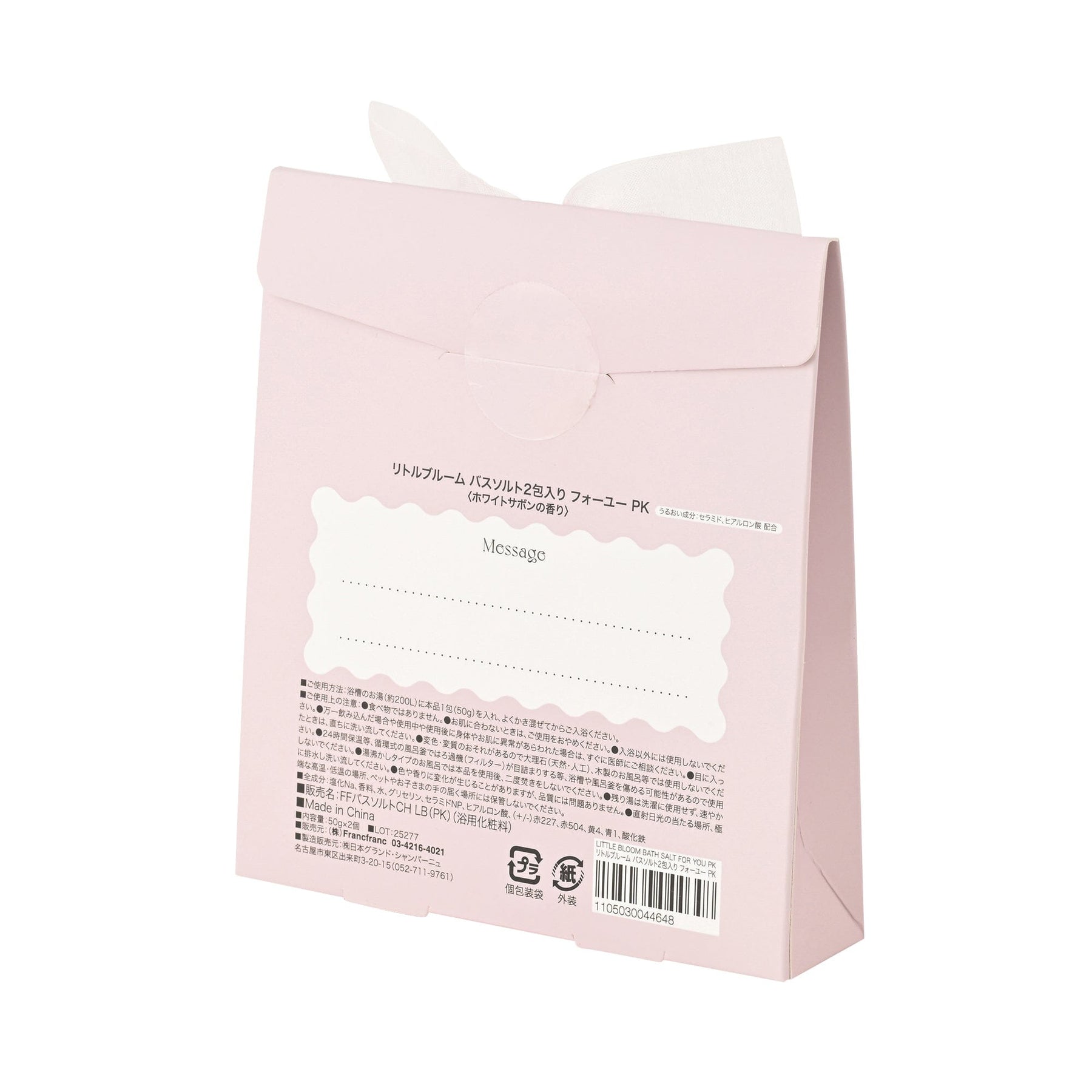 Size: W125×D30×H140mm Contents: 50g x 2 packetsMaterials: Sodium chloride, fragrance, water, glycerin, ceramide NP, hyaluronic acid, (+/-) Red 227, Red 504, Yellow 4, Blue 1, iron oxide