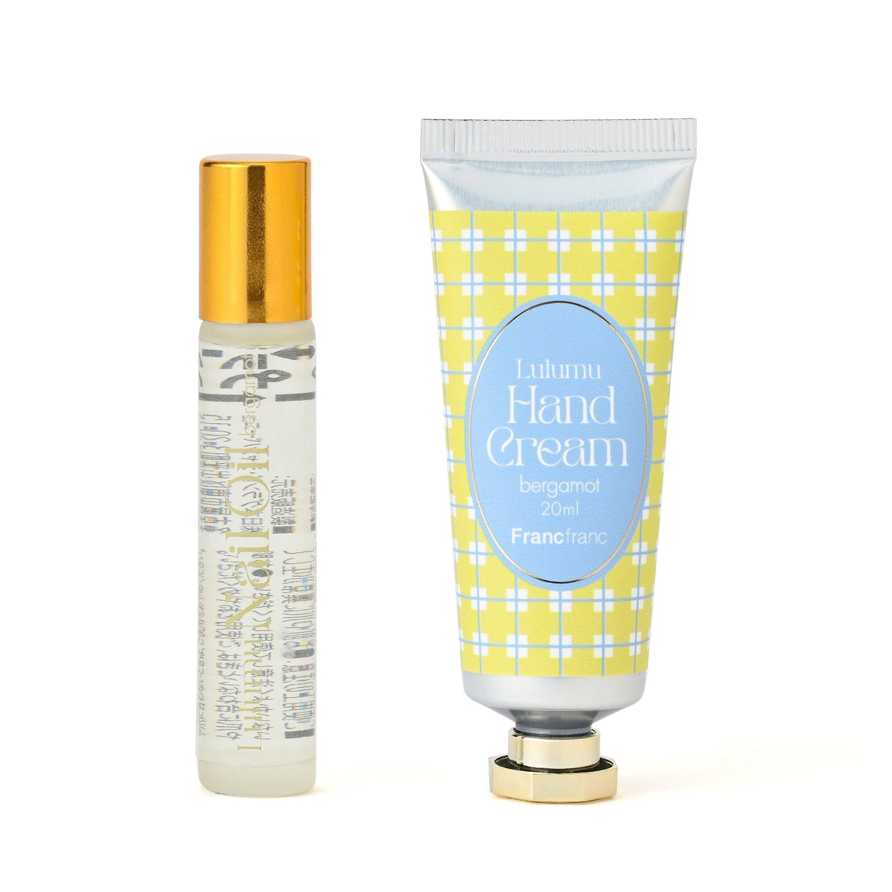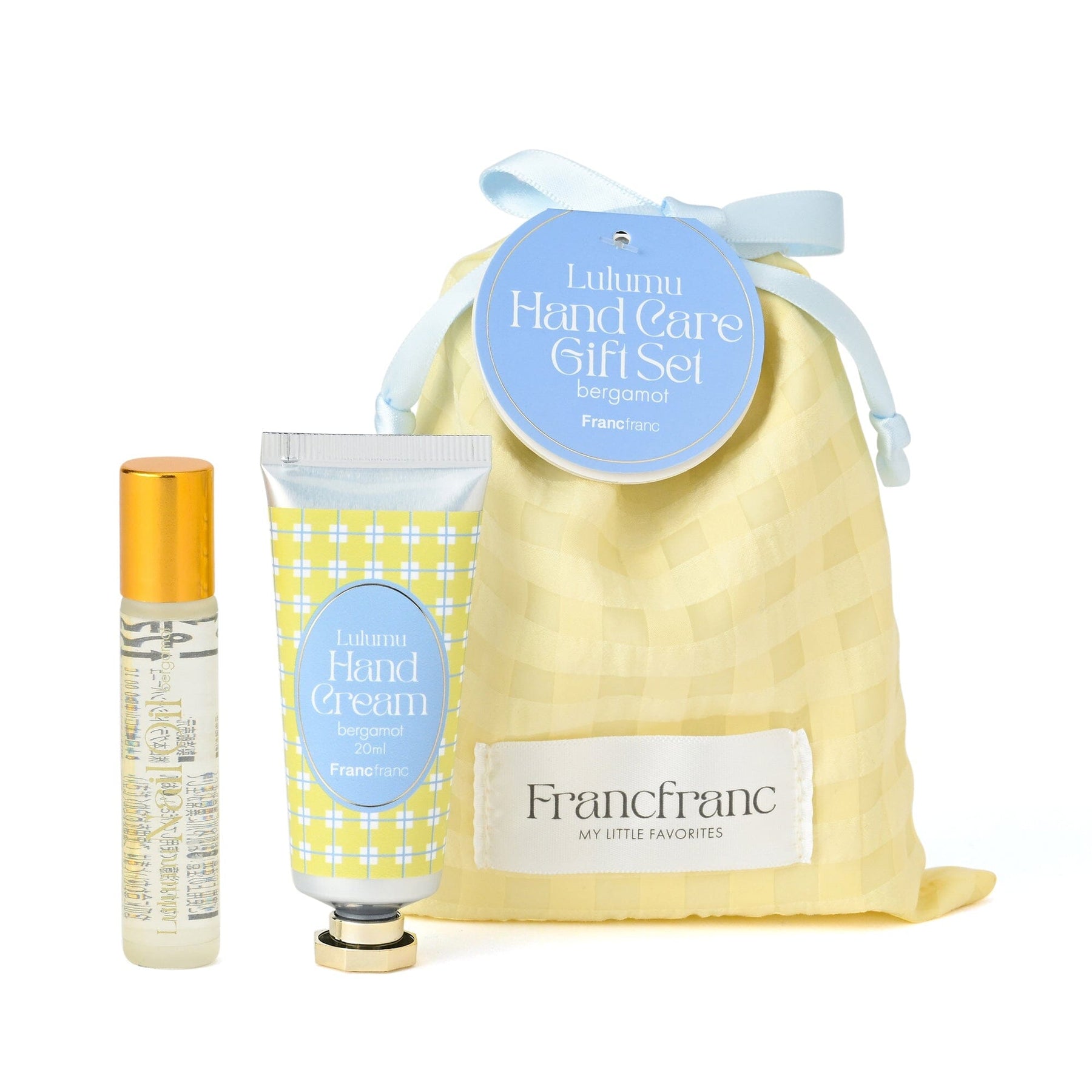 A gift set of hand cream and nail oil that can easily fit in a small bag.The drawstring bag packaging has a pop design using sheer checked fabric.