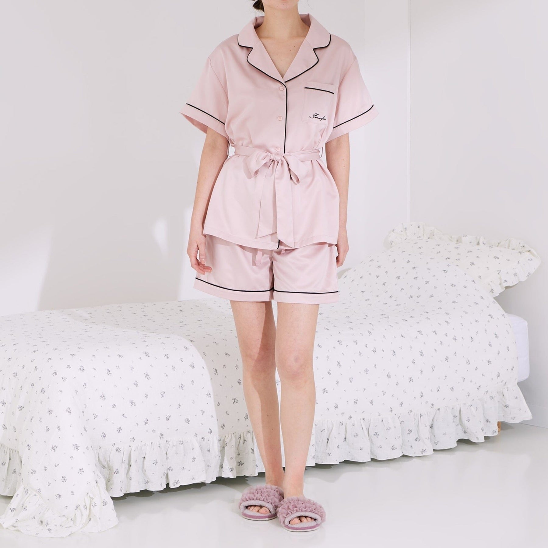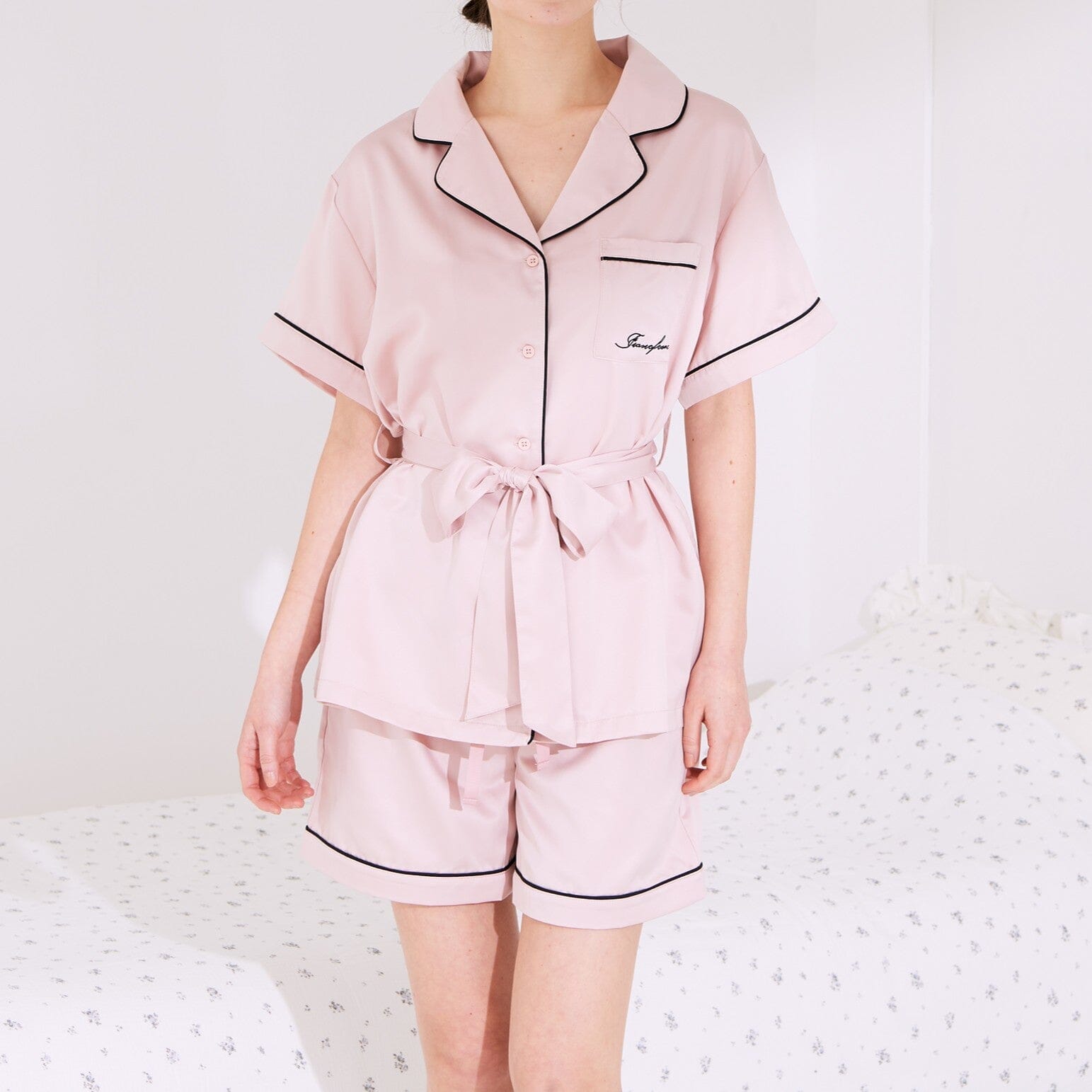 A popular, classic pair of elegant pajamas featuring an embroidered logo.The soft satin fabric is treated with hyaluronic acid, making it comfortable to wear even for long periods of time, for an even smoother feel against the skin.