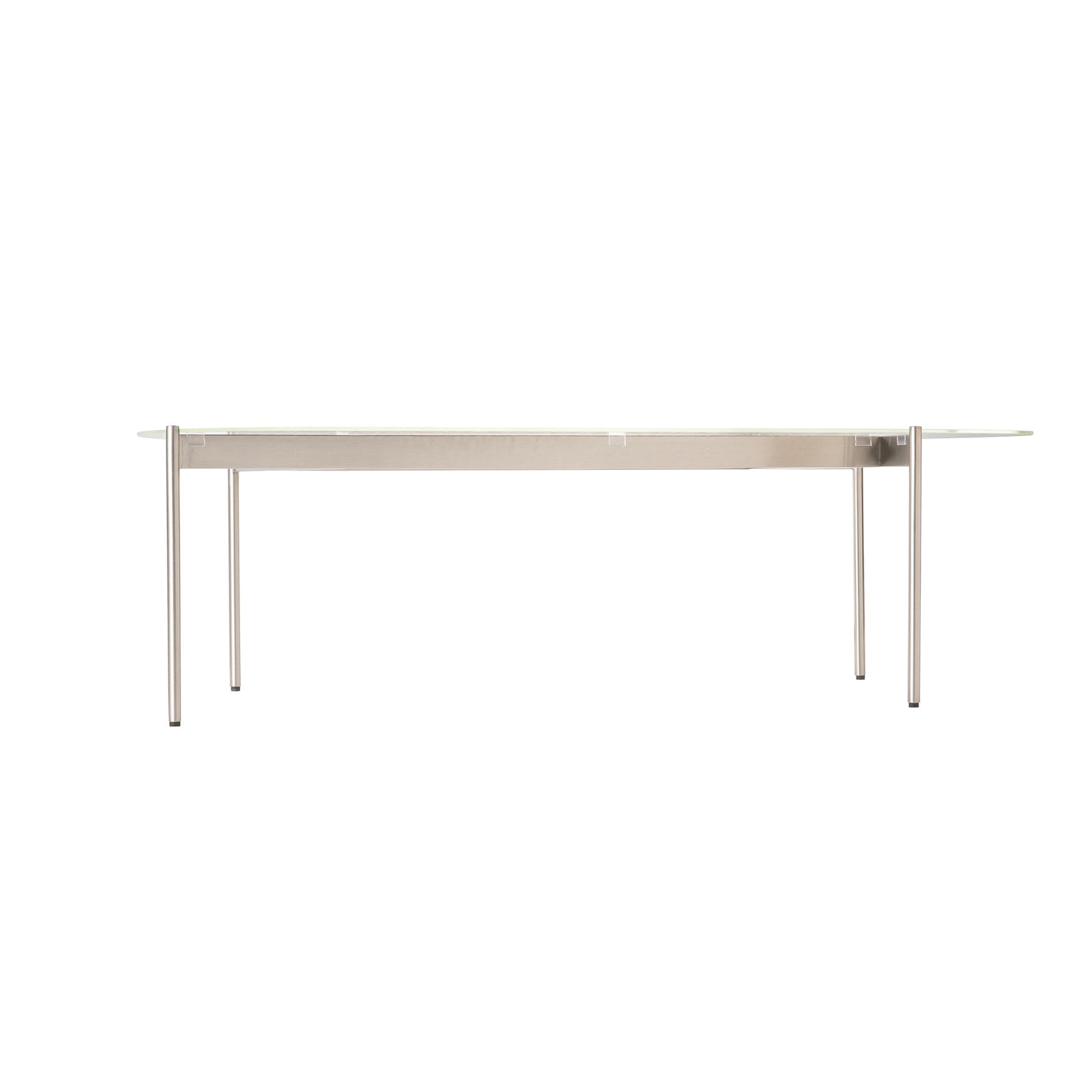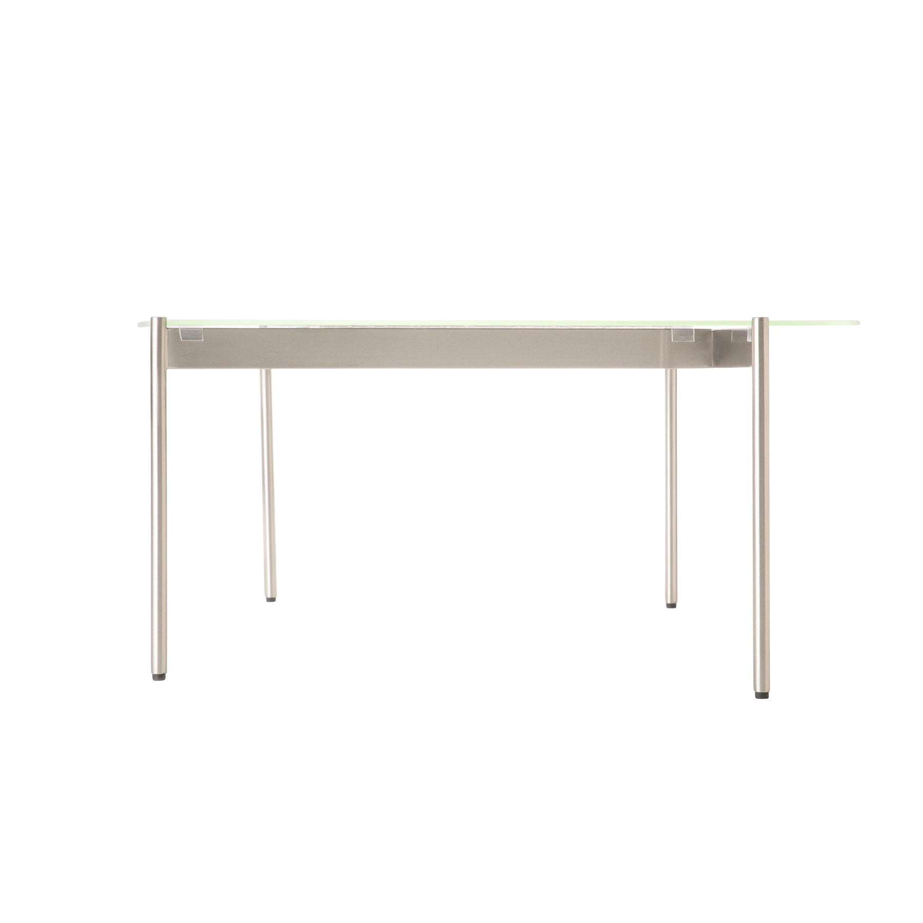 This modern table features a textured glass top that softly reflects light and adds a sense of transparency to the space.