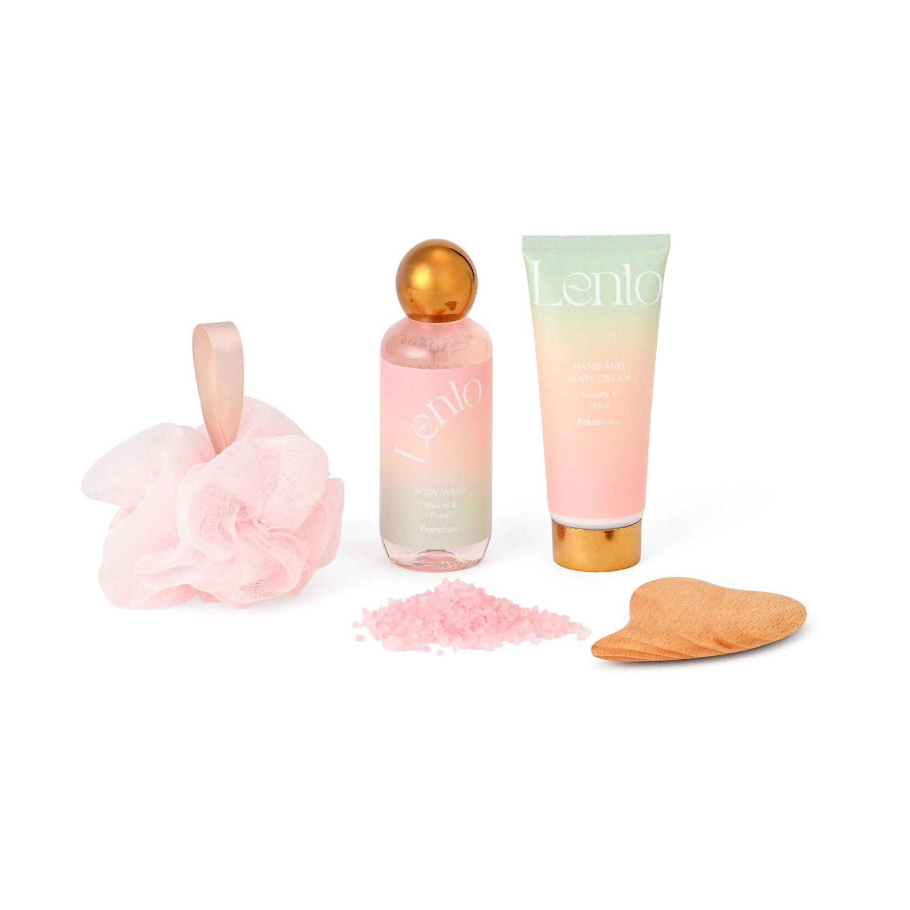 This luxurious 5-piece set includes a Wood Heart Guasha, hand and body cream, body wash, bath salts, and a bath sponge.