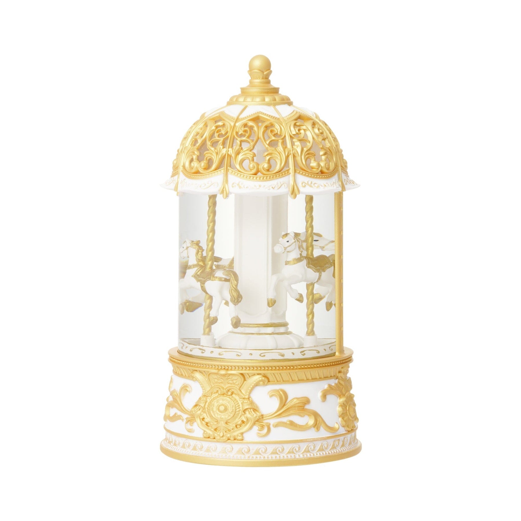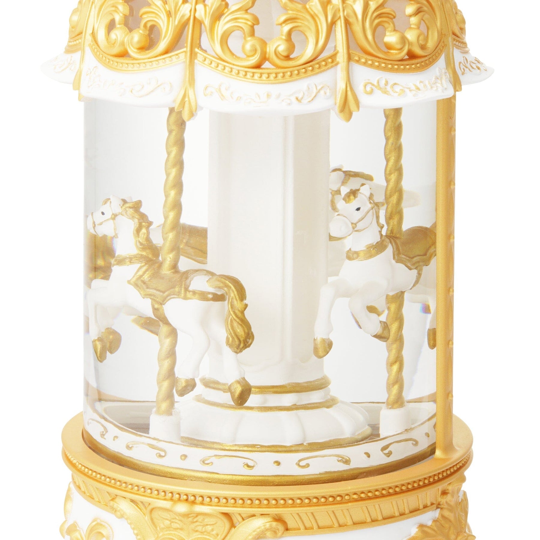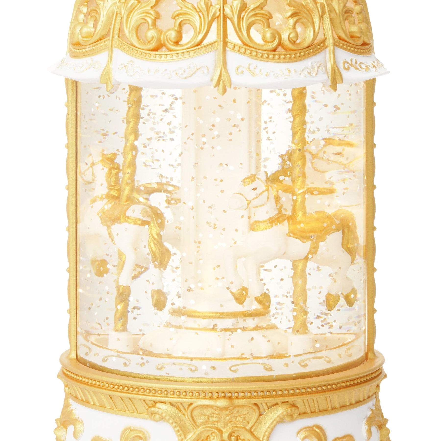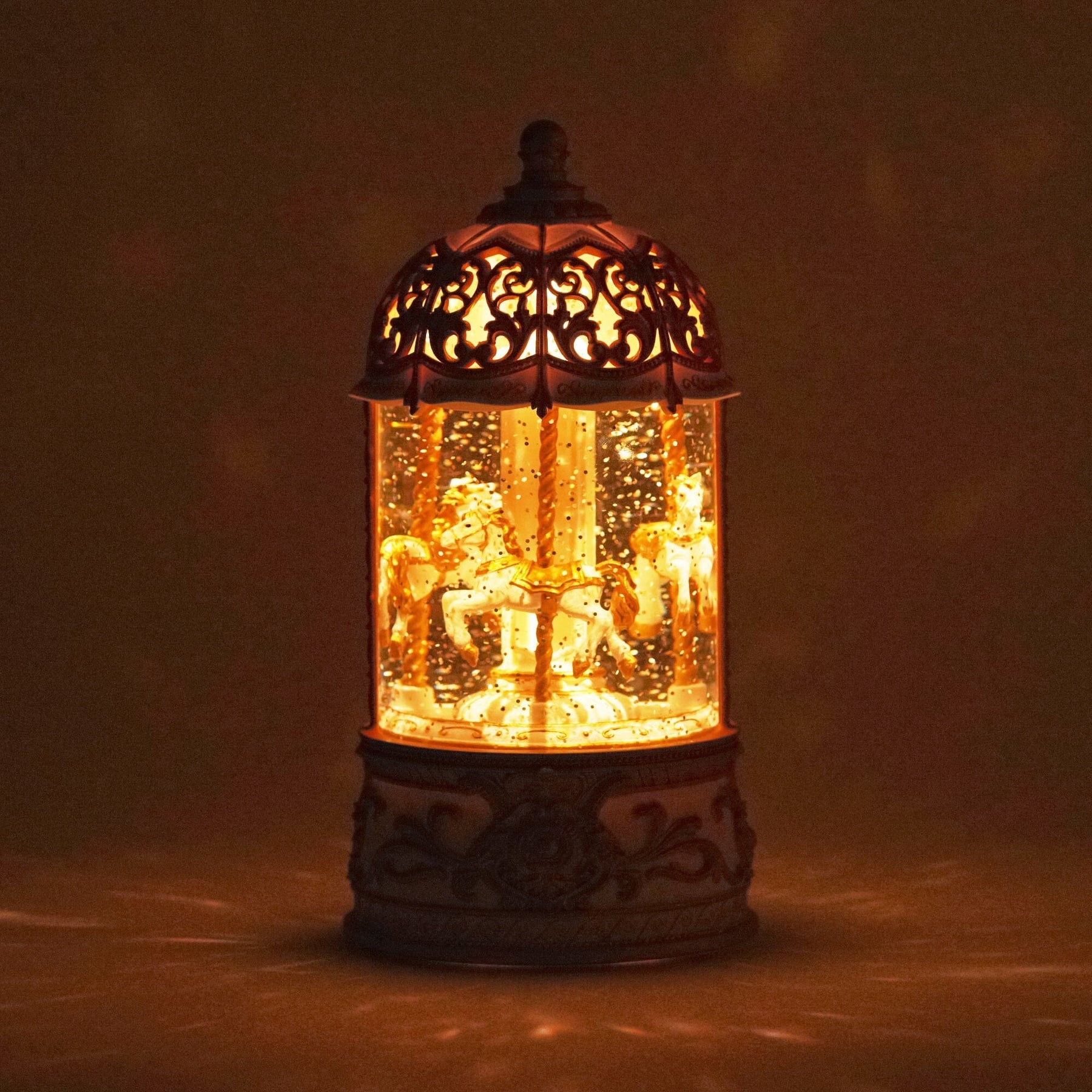 This is an automatically rotating merry-go-round snow globe.When you flip the switch, the lights come on and the glitter automatically dances up.