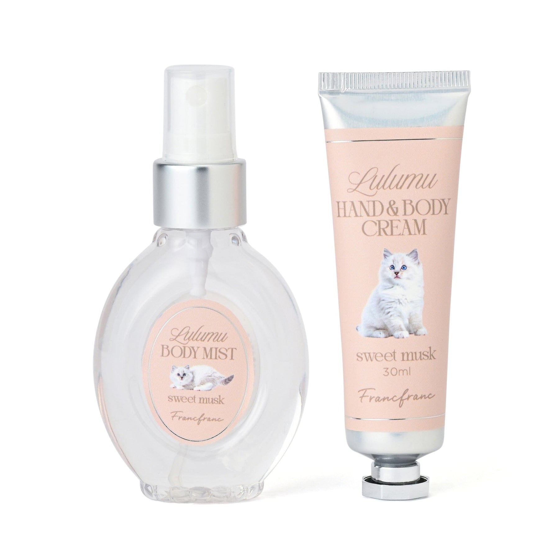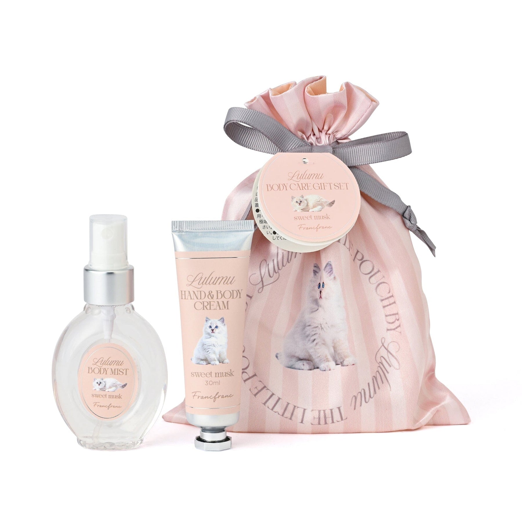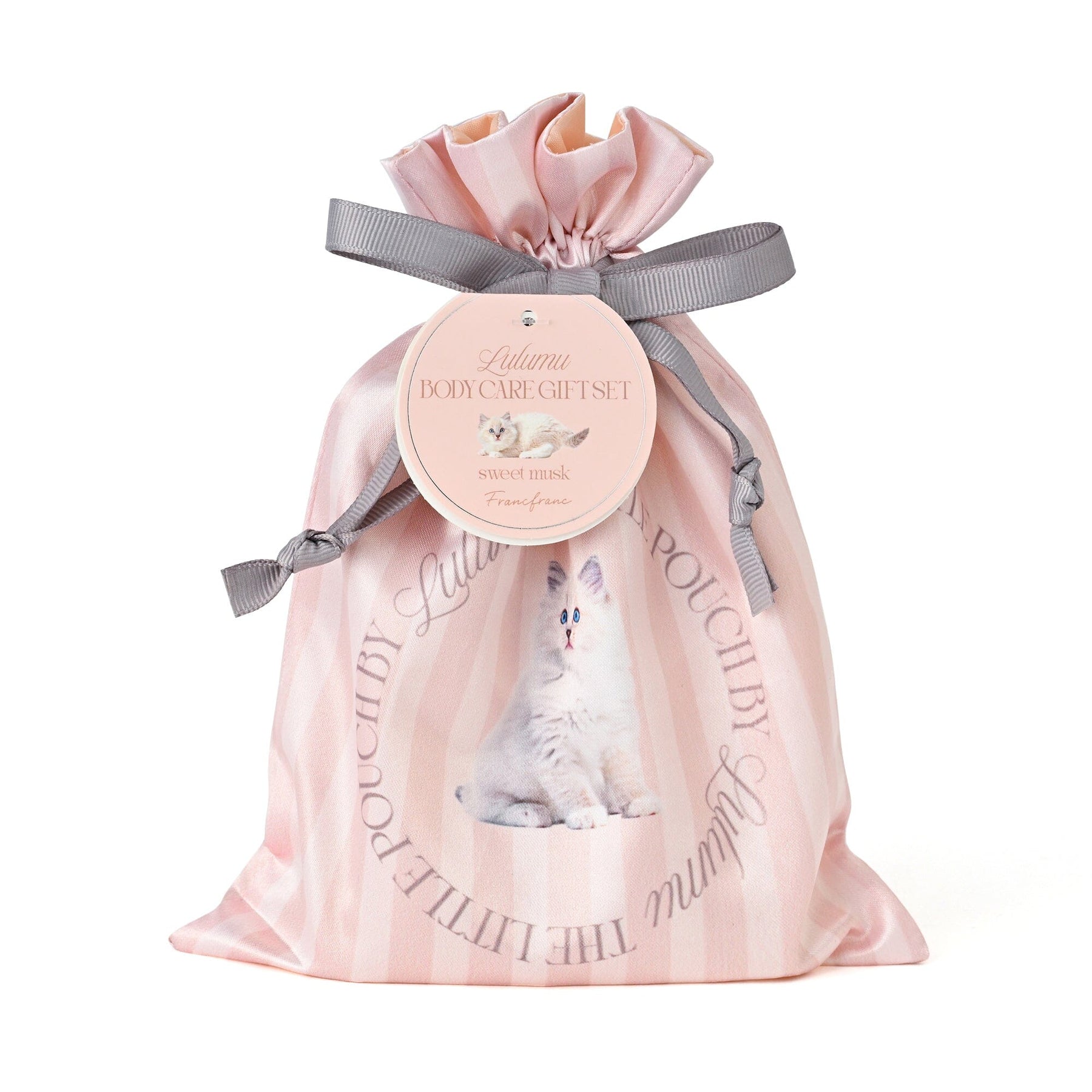 This gift set combines hand and body cream with a softly scented fragrance body mist.The packaging drawstring bag features a cute cat print on shiny satin fabric.