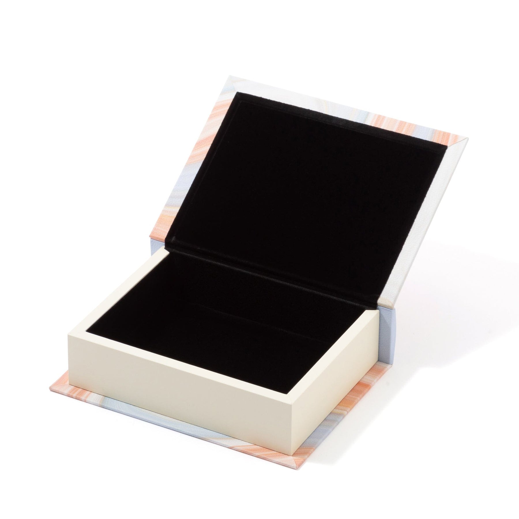 This book-shaped storage box features an artistic marbled design.