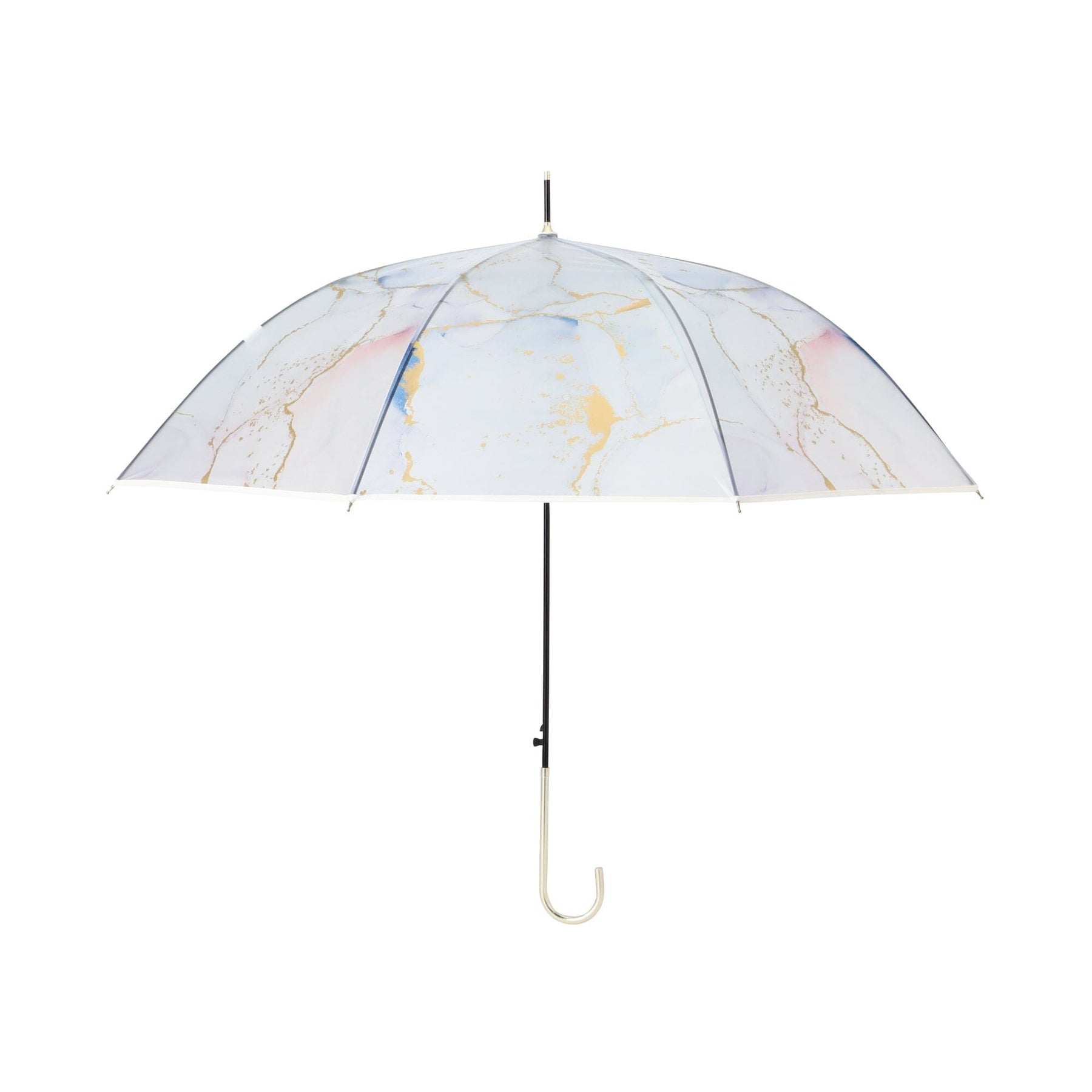 This is a vinyl umbrella with an ink art design.The patterns and colors that accidentally spread from the dripped ink overlap randomly, creating a harmonious finish that looks like gentle waves. The chic sky blue color creates a mature look.