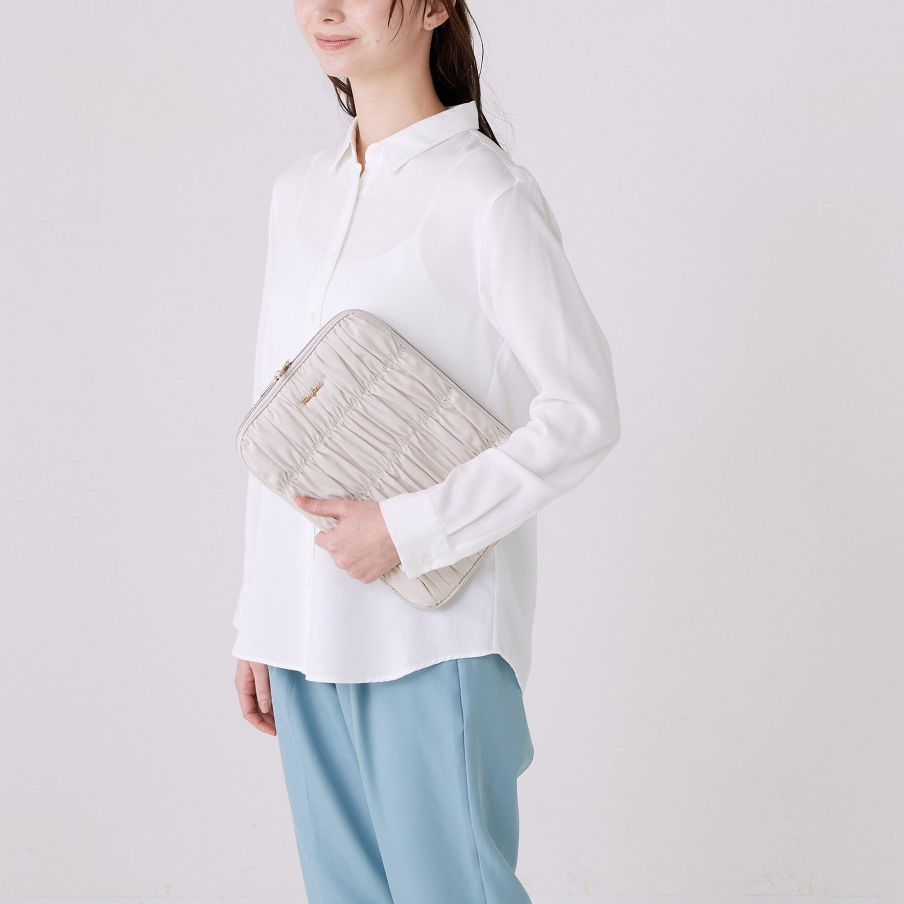 The sophisticated gathered design complements feminine outfits and looks great in the office or workspace.