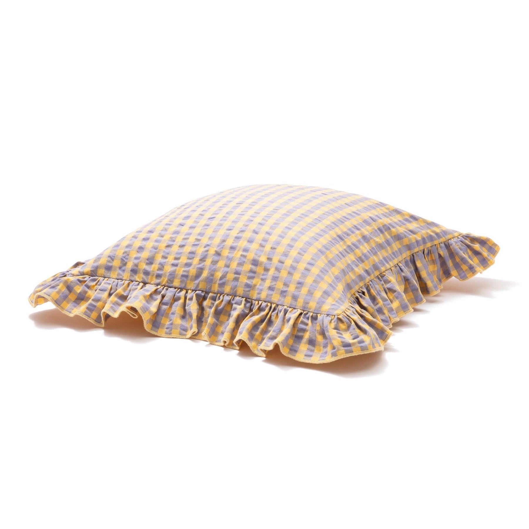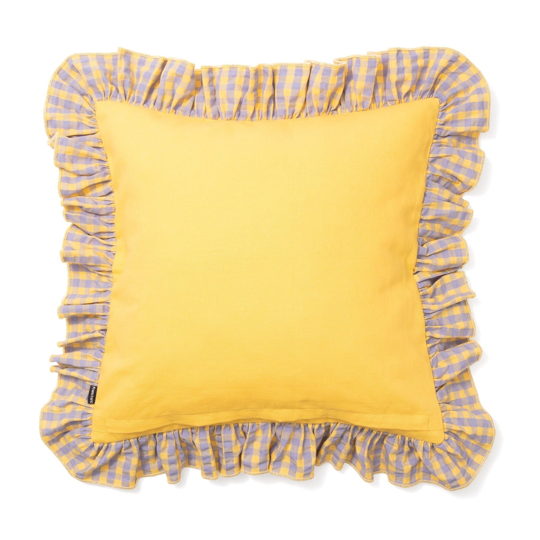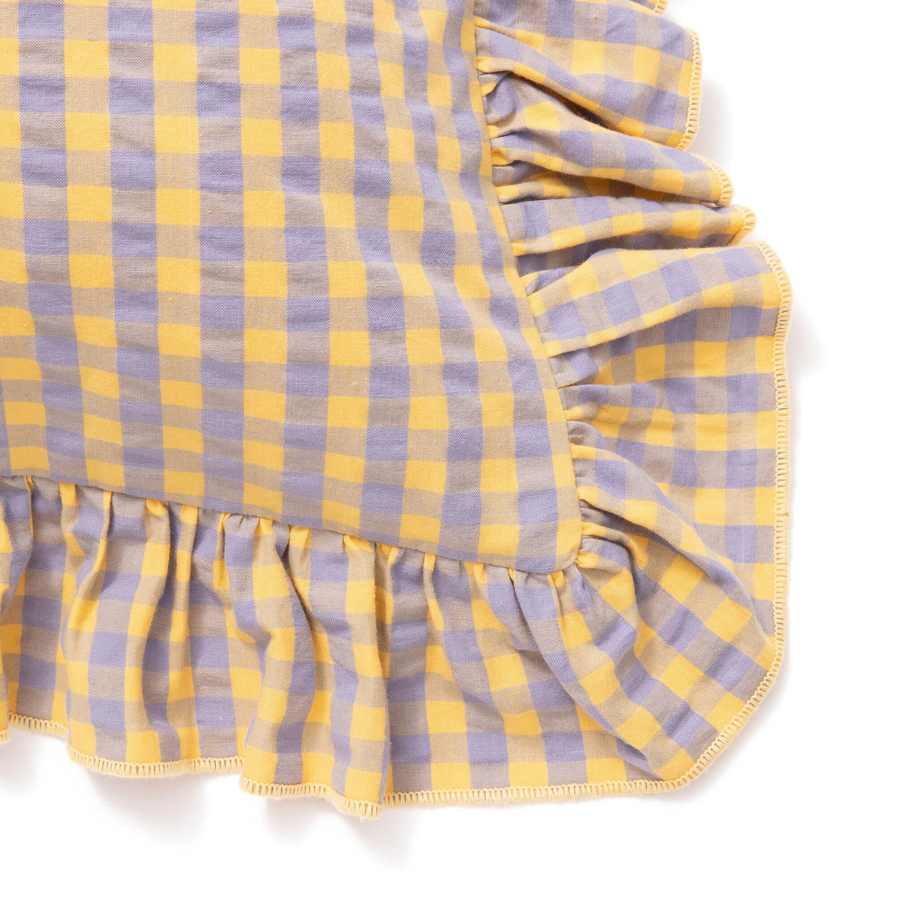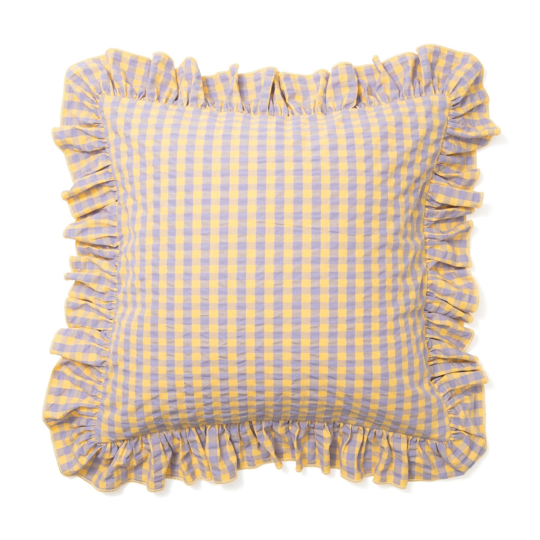 This cushion cover features a small gingham check pattern with added frills.