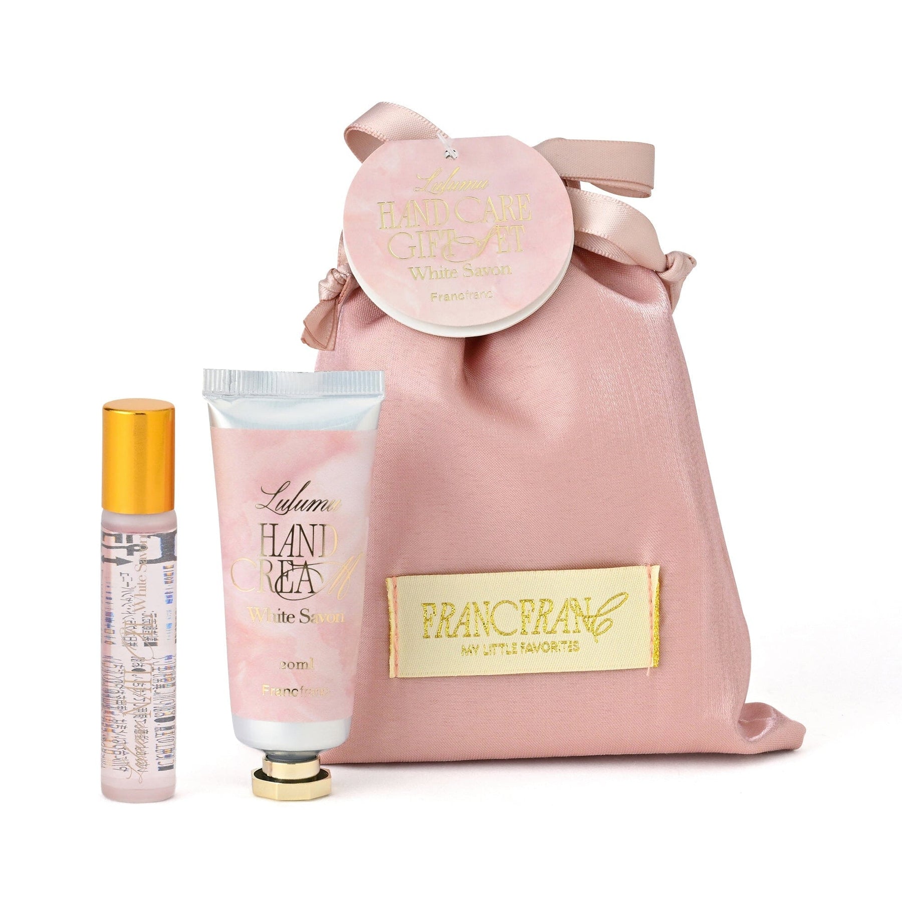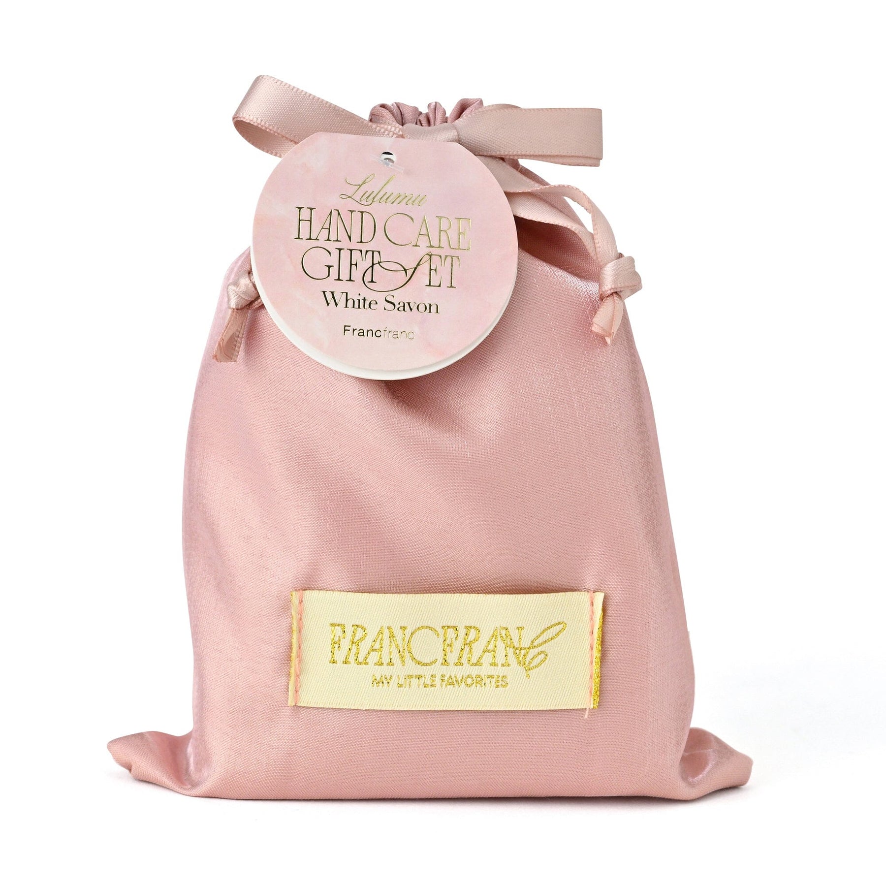 A gift set of hand cream and nail oil that can easily fit in a small bag.The drawstring bag packaging has a feminine design and is made from glossy organza fabric.