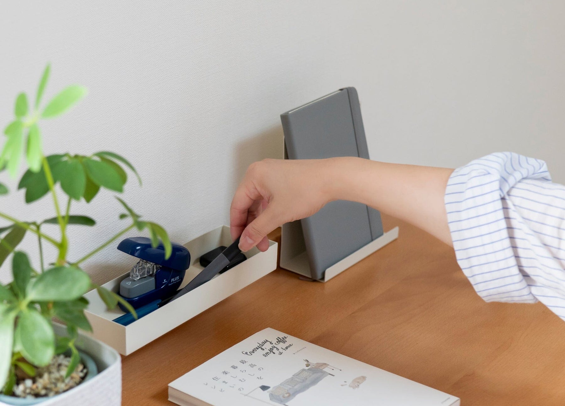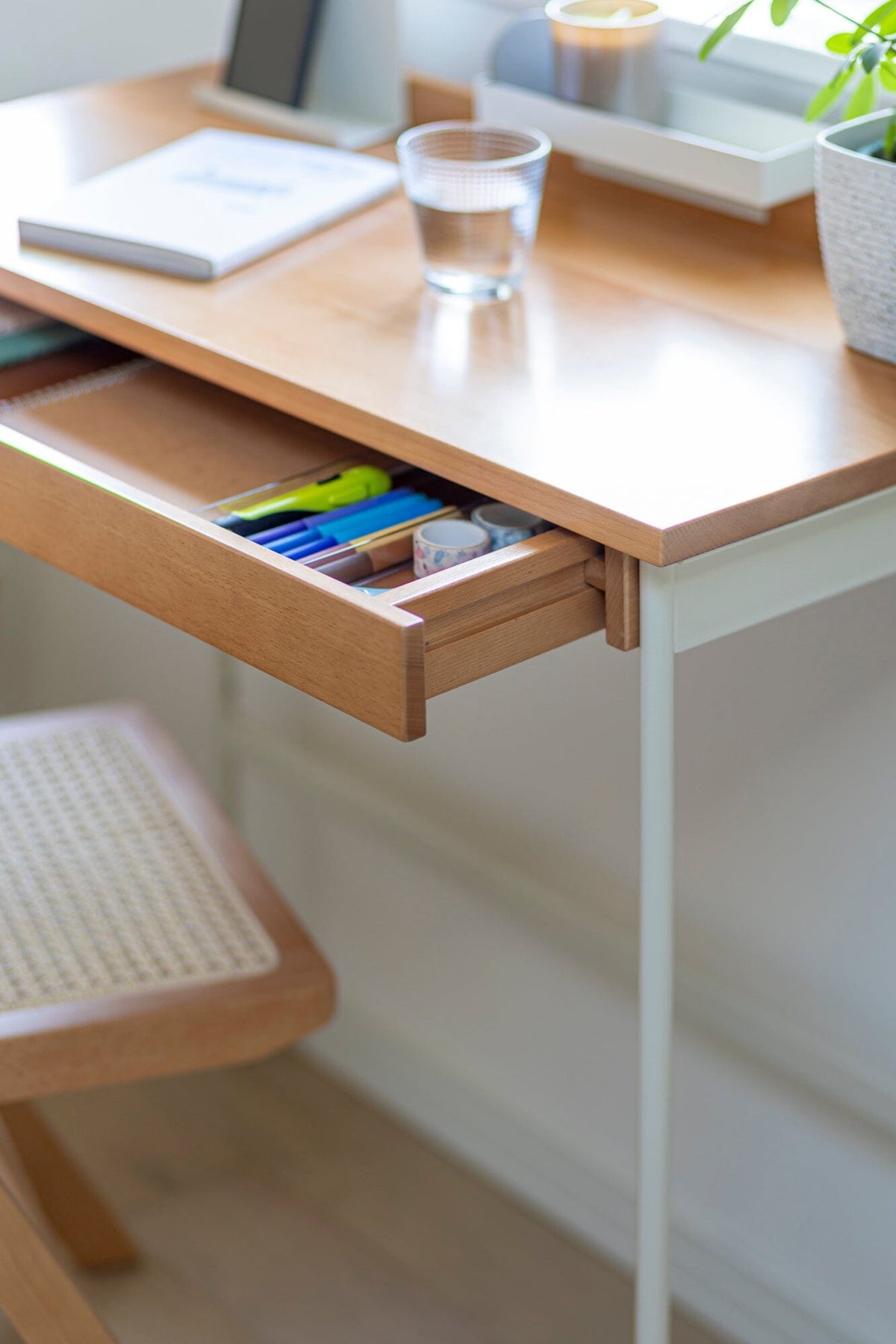 Material: Tabletop: Natural beech wood; Frame: Powder-coated steel; Tray, stand, and hooks: Powder-coated steel